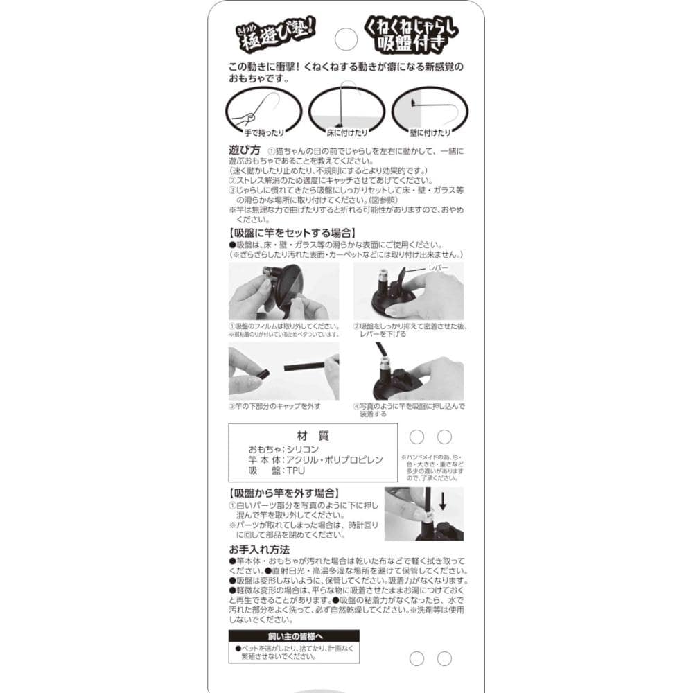 お取り扱い上の注意:●竿本体・おもちゃが汚れた場合は乾いた布などで軽く拭き取ってください。●吸盤は変形しないように、保管してください。吸着力がなくなります。●軽微な変形の場合は、平らな物に吸着させたままお湯につけておくと再生できることがあります。●吸盤の粘着力がなくなったら、水で汚れた部分をよく洗って、必ず自然乾燥してください。※洗剤等は使用しないでください。