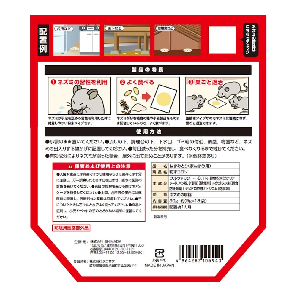 1、ネズミの習性を利用した粉末タイプで効率よく駆除 ※粉末タイプなので、ネズミの体表に付着しやすく、体をなめる習性がある為、無意識に殺鼠剤を食べさせることが可能。 2、ネズミが好む食物の種をそのまま配合 3、ワルファリンを0.1%を配合し高い駆除効果を発揮 4、駆除業者も現場で使用するプロ仕様
