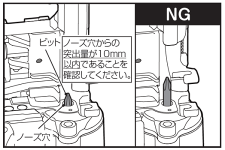 交換用ビットを挿入し交換工具で締め込む前に、ビット先端の位置を確認してください。 誤った状態でねじ込むと機械内部でつまり、取り出せなくなる恐れがあります。