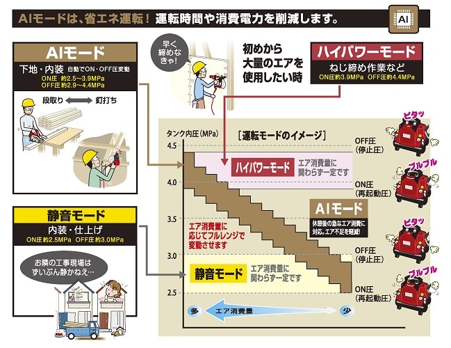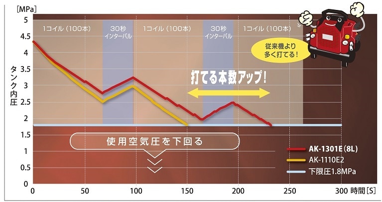 エア不足を補うため、エア量が必要でない作業でも、常にタンク内圧が高めの設定になりがちでした。