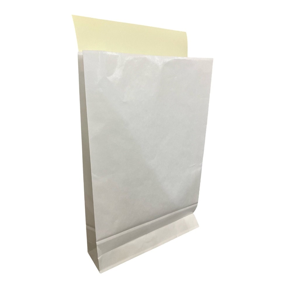 ●サイズ/巾350×マチ115×高さ570+ベロ60mm ●坪量/120g/平方メートル ●材質/片艶晒+PE ●仕様/上部糊付ベロ付 ●生産国/日本 ●特徴/水をはじき、塗れても大丈夫