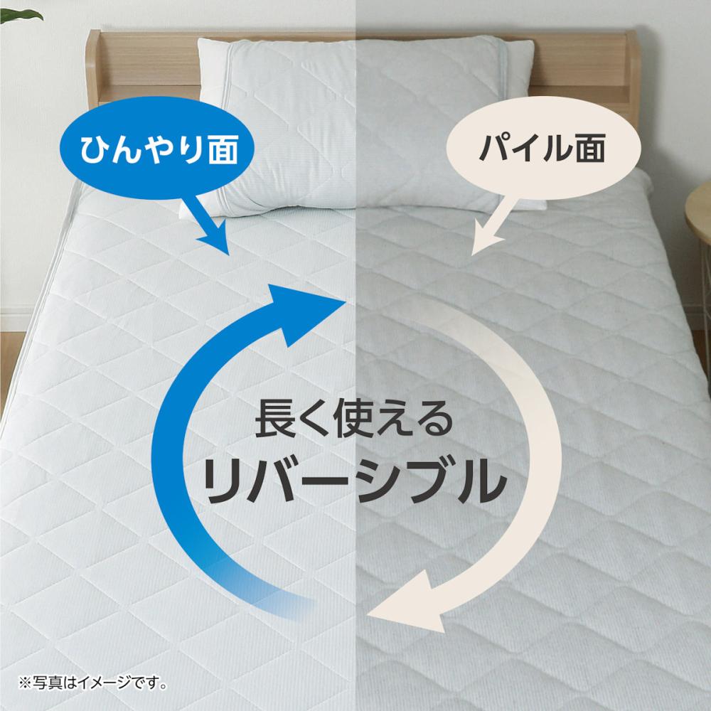 ■暑い時期は接触冷感のひんやり面、肌寒い時期はパイル面など季節に合わせて使い分けができるリバーシブルタイプ。