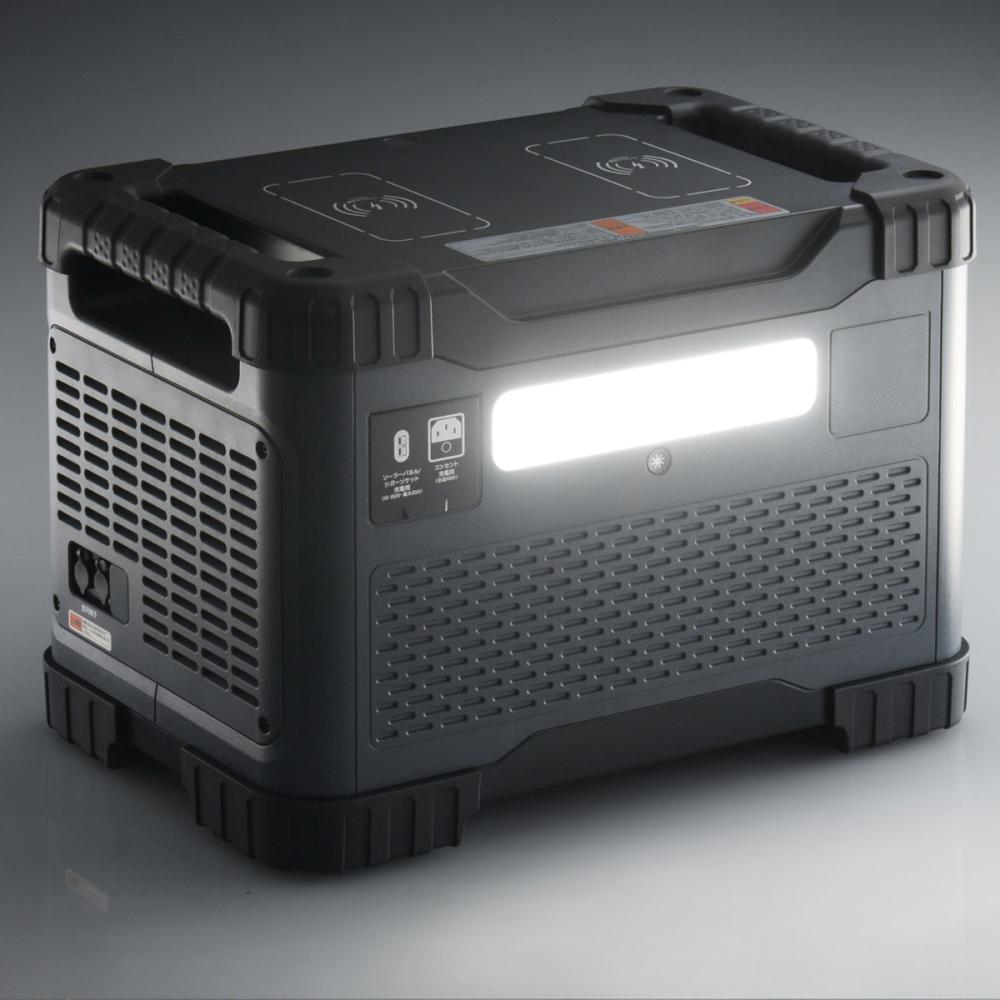 "●暗い場所で役立つ大型LEDライト付 ●電池容量 2150.4W ●定格出力 2400W ●最大瞬間出力 2400W ●AC充電時間 2時間 ●出力 AC 20A×6 DC(シガーソケット)12V×1 USB-C 100W×2 USB-A 24W×4"