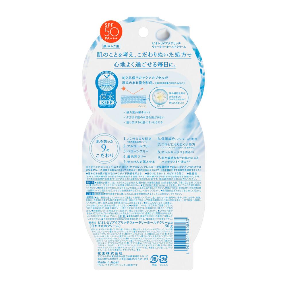 強力紫外線をカット(SPF50/PA+++)&水を抱え込んだ膜をまとって夕方までみずみずしさつづく、ノンケミカル処方(紫外線吸収剤フリー)の日やけ止め。 紫外線散乱剤をみずみずしいアクアカプセルに閉じ込めた!塗り広げると肌にすっとなじむ。 もっちり水感クリーム。 化粧下地にも(明るく仕上がる*)。 アルコールフリー。 パラベンフリー。 着色料フリー。 せっけんで落とせる。 *メイクアップ効果