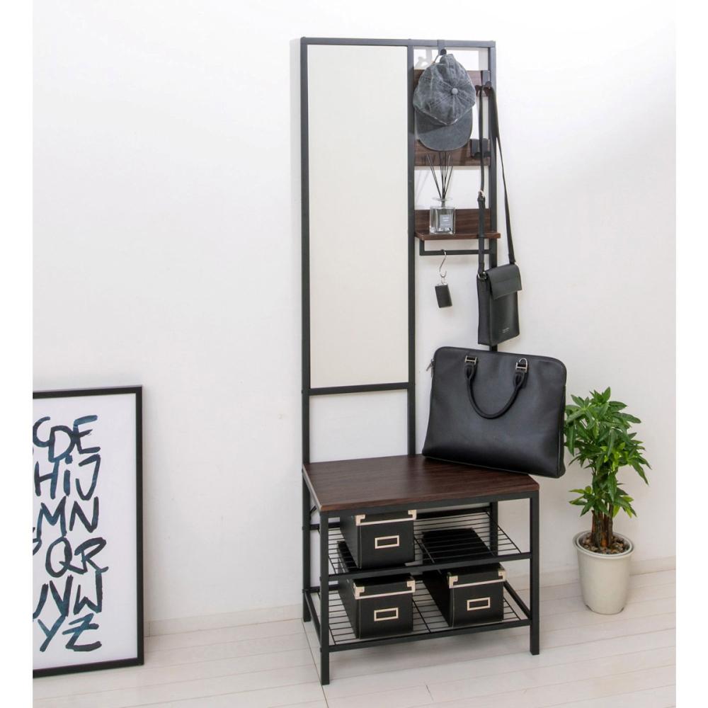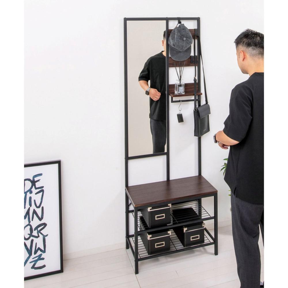 ■コーディネートのチェックができる便利なミラー付。用途に合わせてディスプレイ棚の位置とフックの位置を変えられます。