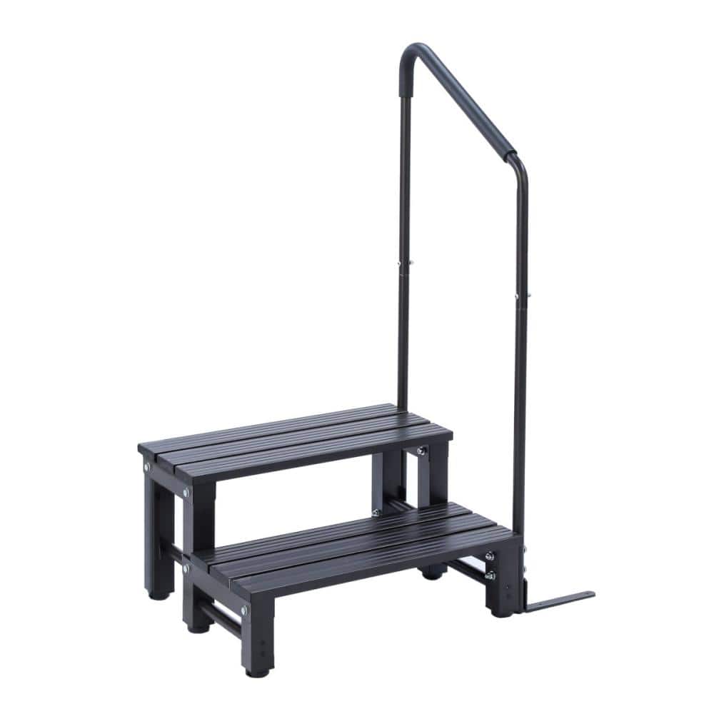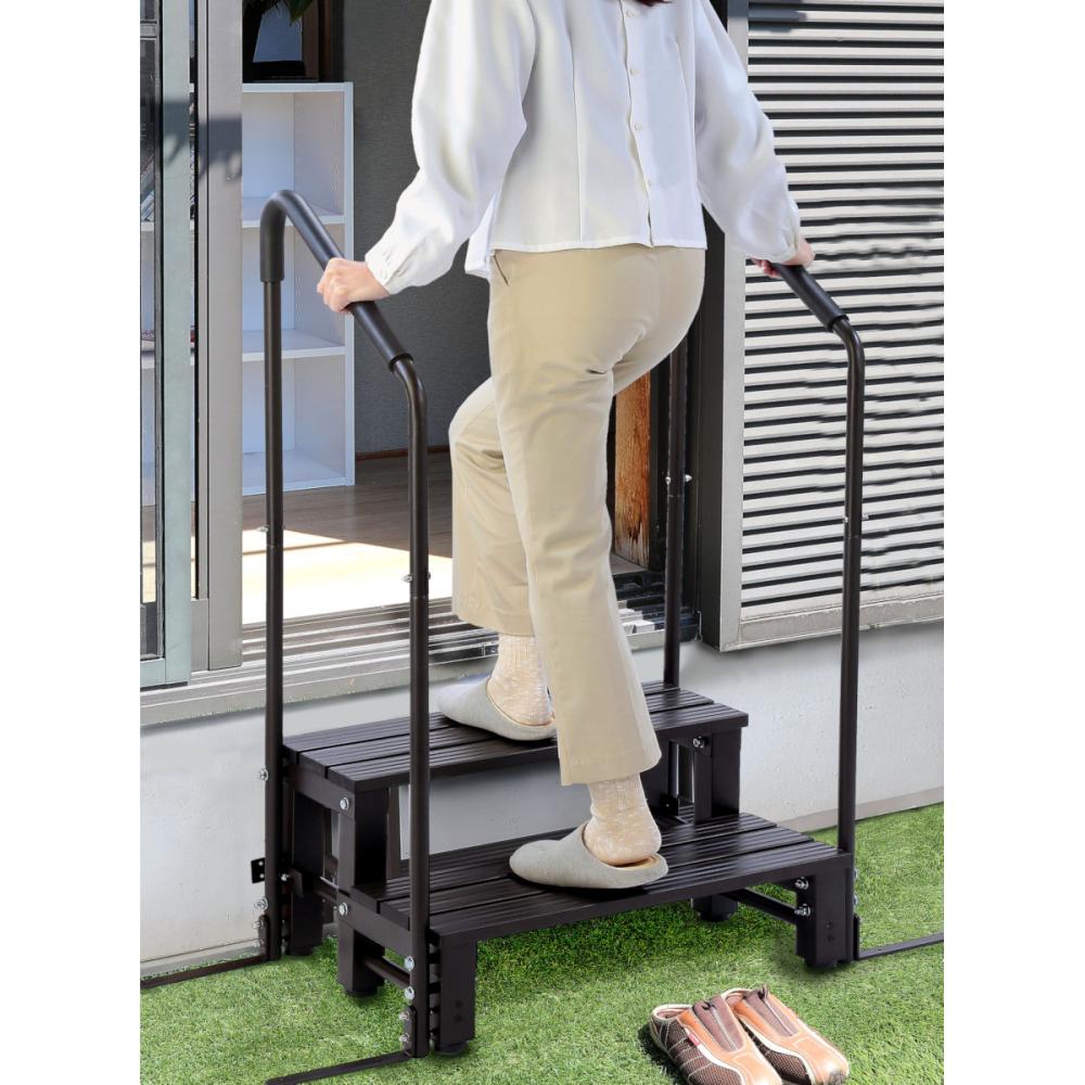 ●しっかり掴める手すり付きアルミステップ。 ●左右両方の手すり付き。片側だけ取り付けも可能です。 ●ご年配の方やお子様も安心して昇り降りできます。 ●足裏にアジャスターが付いているので、地面のガタ付きに合わせて調整が可能です。 ●軽くて丈夫なアルミ製で水に強く、お手入れもサッと拭くだけでOK ●付属の工具と金具のみで組み立てできます。
