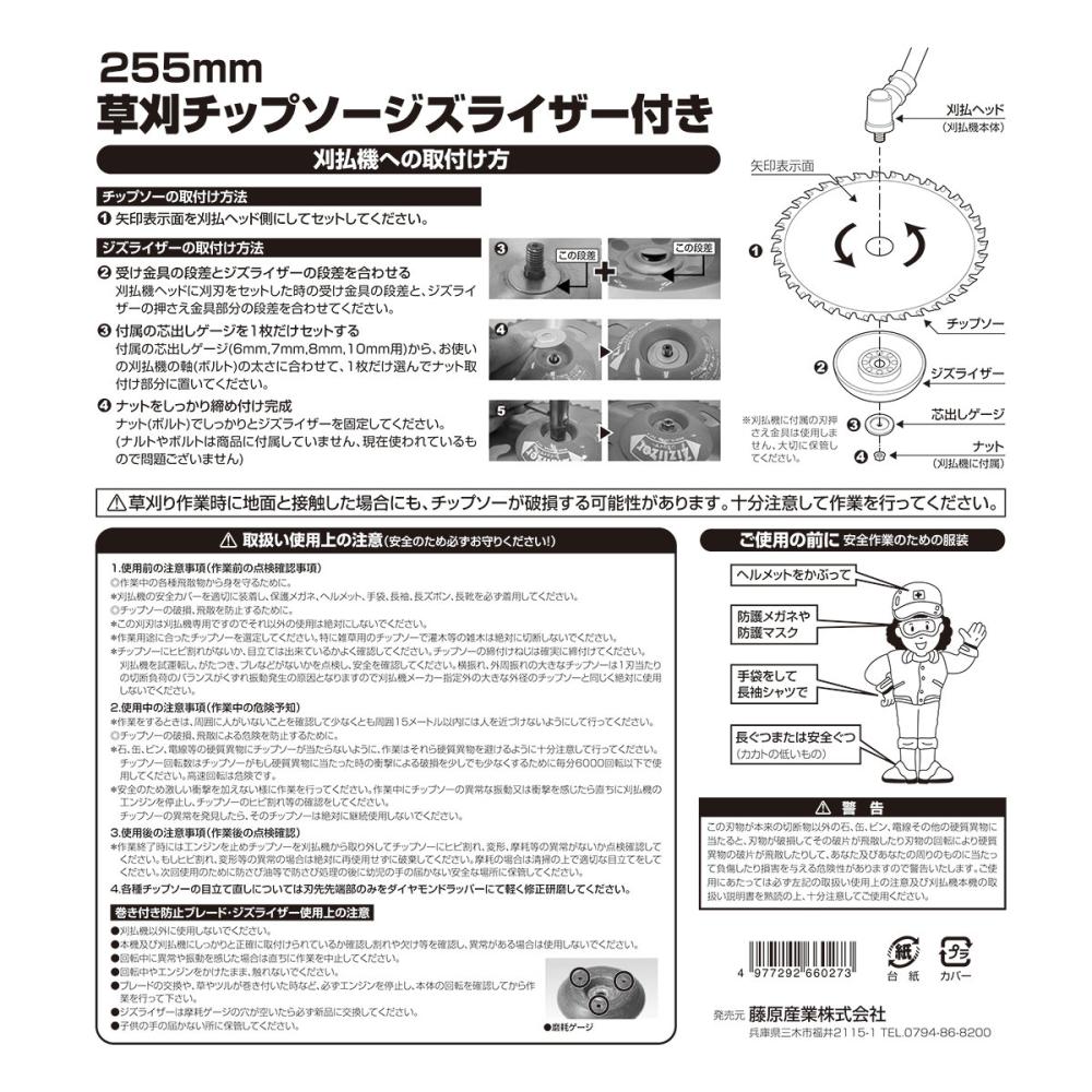 ●刈払作業用 ●草刈作業を快適にするジズライザー付き ●軽量タイプチップソーで刈払作業の負担を軽減 ●地面を滑らせ楽に短く草刈り作業が可能に ●ジズライザーサイズ:幅径100×高20mm。
