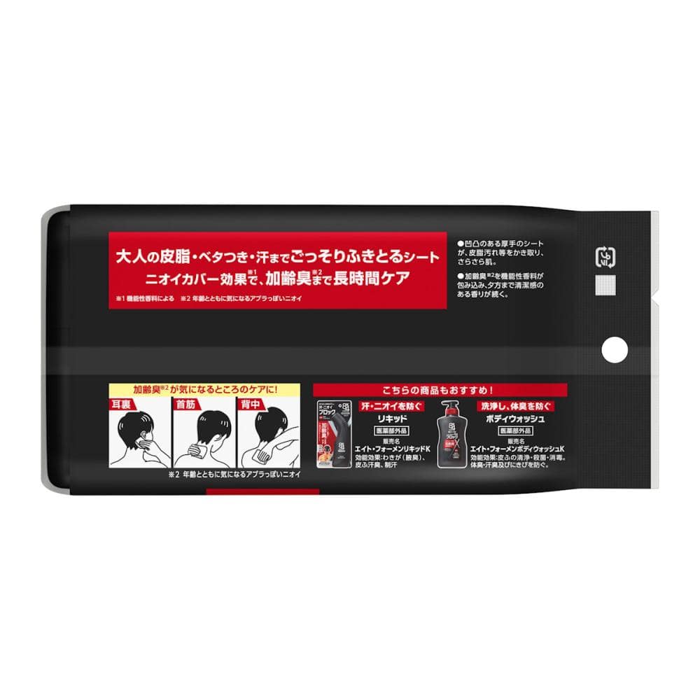 ●大人の皮脂・ベタつき・汗までごっそりふきとるシート ●ニオイカバー効果※1で、加齢臭※2まで長時間ケア ※1機能性香料による ※2年齢とともに気になるアブラっぽいニオイ ●凹凸のある厚手のシートが、皮脂汚れ等をかき取り、さらさら肌 ●耳裏、首筋、背中などの、加齢臭※2が気になるところのケアに ●加齢臭※2を機能性香料が包み込み、夕方まで清潔感のある香りが続く ●爽やかなシトラス&ティーの香り
