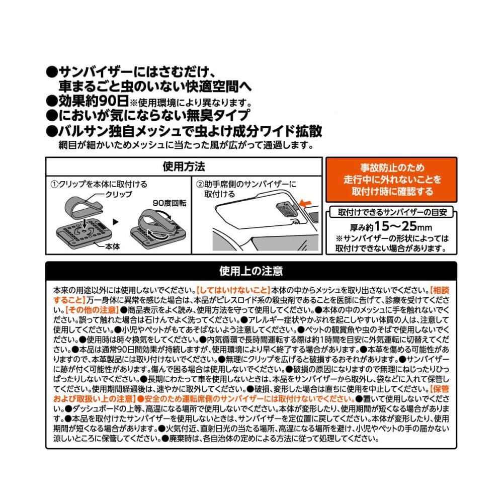 ●サンバイザーにはさむだけ、約90日間 車まるごと虫のいない快適空間に(使用環境により異なります) ●においが気にならない無臭タイプ ●バルサン独自メッシュで虫よけ成分がワイド拡散 ●ドライブ、アウトドアにも ●交換時期を自動でお知らせする「お知らせバルサン」※お知らせバルサンとは、商品パッケージに記載されるQRコードから登録すると交換時期をメールで通知する機能のこと。
