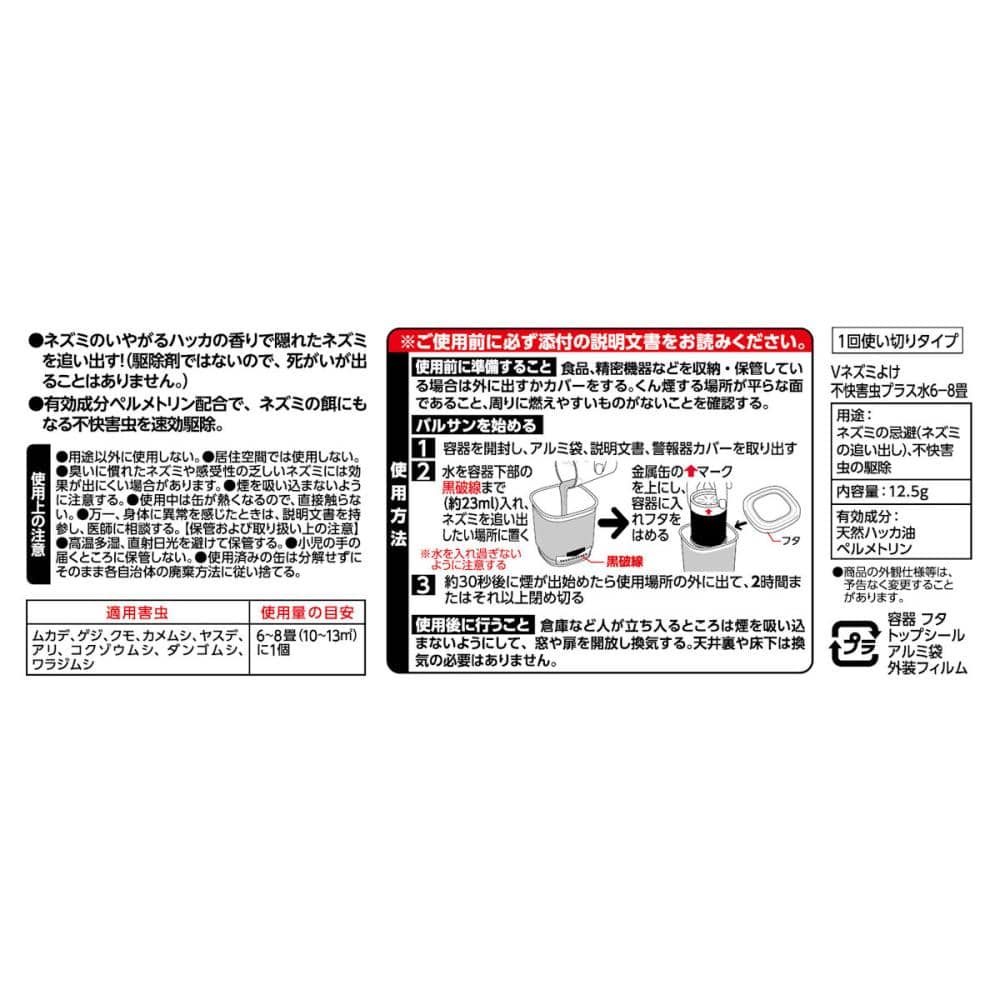 適応害虫:ネズミの忌避(ネズミの追い出し)、ムカデ、ゲジ、クモ、カメムシ、ヤスデ、アリ、コクゾウムシ、ダンゴムシ、ワラジムシの駆除