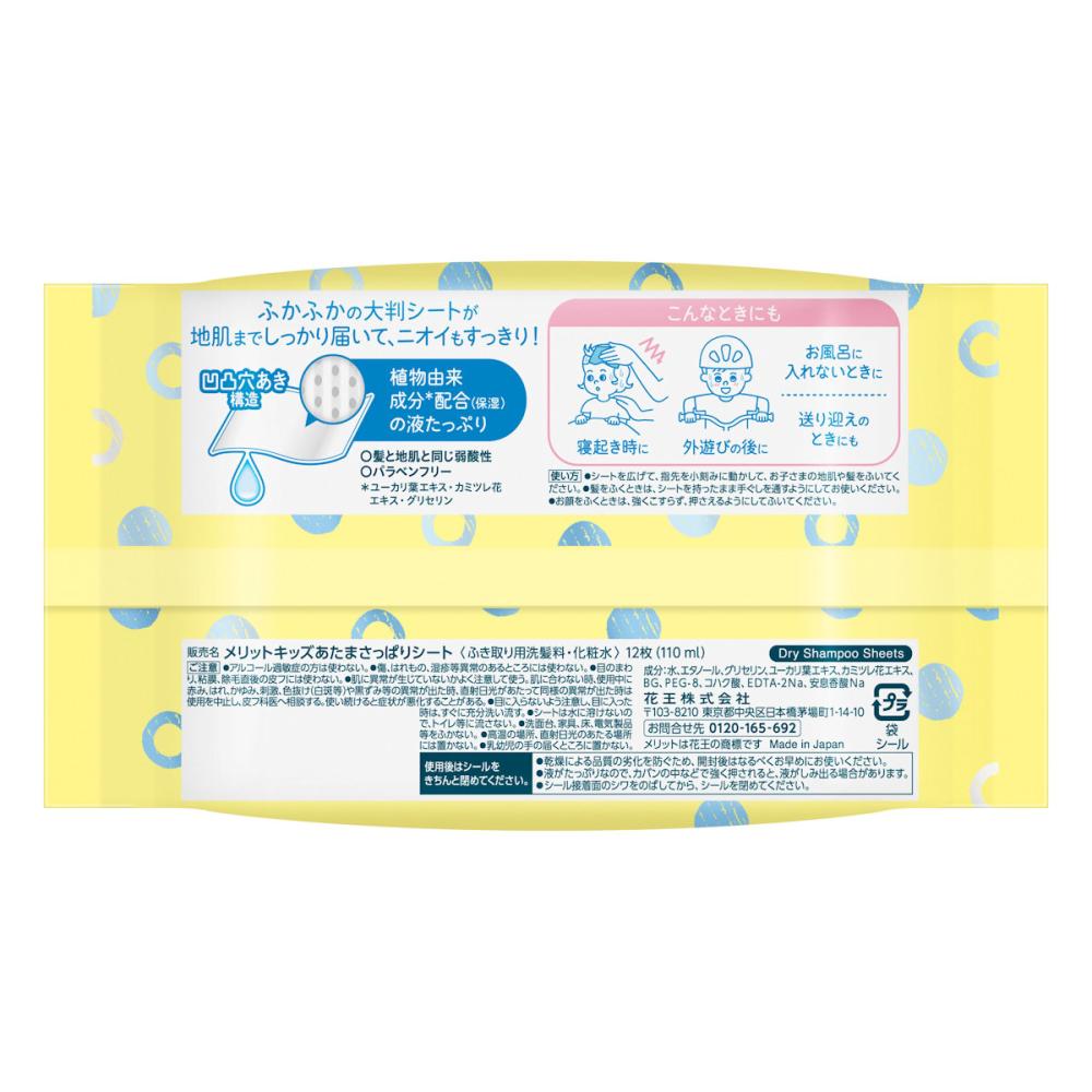 外遊びやお昼寝後のびっしょり汗、お風呂に入れないときなどに! ふかふかの大判シートが地肌までしっかり届いて、ニオイもすっきり!顔にも使える。 ●メントール無配合、無香料、無着色、パラベンフリー ●植物由来成分*(保湿)配合*ユーカリ葉エキス・カミツレ花エキス・グリセリン ●髪と地肌と同じ弱酸性