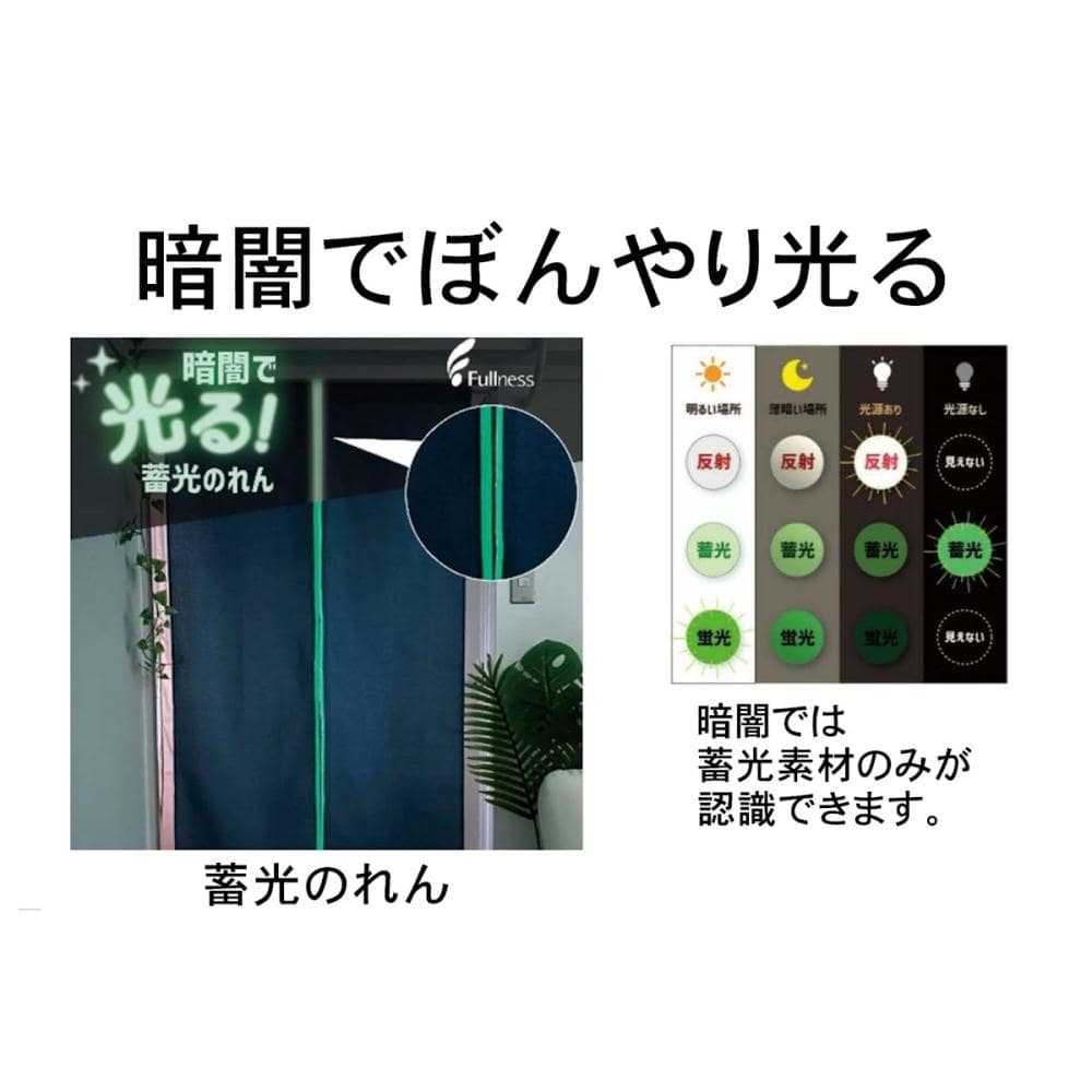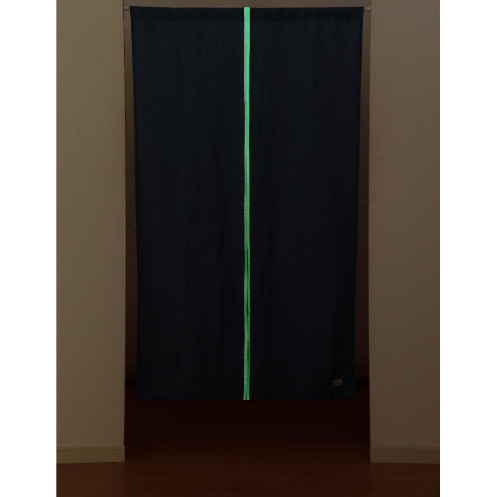 ■のれんのフチに蓄光テープを使用。暗闇でぼんやり柔らかに光ります。災害時の停電や、夜中のトイレ誘導などに最適です。