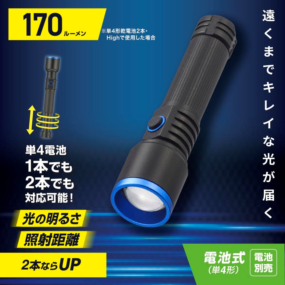 ●ズーム操作で長距離の照射が可能(最大照射距離 約225m) ●ズームアウトでワイドビームも ●明るさ調節機能付き(High/Low/点滅) ●全光束170ルーメン(単4形乾電池2本使用/High時) ●単4電池1本でも2本でも使用可能 ■光源:LED(交換不可) ■電源:単4形乾電池×1本・2本(別売) ■保護等級:IPX4(防飛まつ)※水の飛まつに対して保護する。あらゆる方向からの水の飛まつによっても有害な影響を及ぼしてはならない。(JIS C0920:2003による) ■照射距離:約225m(最大値) ■外形寸法:(約)最大径29×長さ107mm(電池1本の場合) ■本体質量:約57g(電池除く) ■光束及び連続点灯時間:※未使用・新品のアルカリ乾電池使用・ズームアウト時 ≪乾電池2本使用≫ 光束(明るさ)…High 170 lm/Low 60 lm、連続使用時間…High 約1.5時間/Low 約5.5時間 ≪乾電池1本使用≫ 光束(明るさ)…High 30 lm/Low 10 lm、連続使用時間…High 約6.5時間/Low 約13時間 ■照度:※単4形乾電池2本・ズームインの場合 High…0.1m/約110000ルクス、0.5m/約36500ルクス、1m/約12500ルクス Low…0.1m/約40000ルクス、0.5m/約9500ルクス、1m/約
