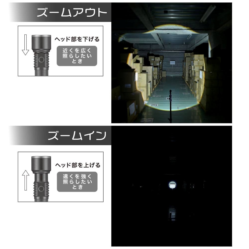 ●ズーム操作で長距離の照射が可能(最大照射距離 約245m) ●ズームアウトでワイドビームも ●明るさ調節機能付き(High/Low/点滅) ●全光束250ルーメン(単3形乾電池2本使用/High時) ●単3電池1本でも2本でも使用可能 ■光源:LED(交換不可) ■電源:単3形乾電池×1本・2本(別売) ■保護等級:IPX4(防飛まつ)※水の飛まつに対して保護する。あらゆる方向からの水の飛まつによっても有害な影響を及ぼしてはならない。(JIS C0920:2003による) ■照射距離:約245m(最大値) ■外形寸法:(約)最大径33×長さ115mm ※電池1本の場合 ■本体質量:約82g(電池除く) ■光束及び連続点灯時間:※未使用・新品のアルカリ乾電池使用・ズームアウト時 ≪乾電池2本使用≫ 光束(明るさ)…High 250 lm/Low 90 lm、連続使用時間…High 約3.5時間/Low 約12時間 ≪乾電池1本使用≫ 光束(明るさ)…High 55 lm/Low 15 lm、連続使用時間…High 約15時間/Low 約28時間 ■照度:※単3形乾電池2本・ズームインの場合 High…0.1m/約124500ルクス、0.5m/約43400ルクス、1m/約14500ルクス Low…0.1m/約50000ルクス、0.5m/約13200ルクス、1m/約4250ルクス