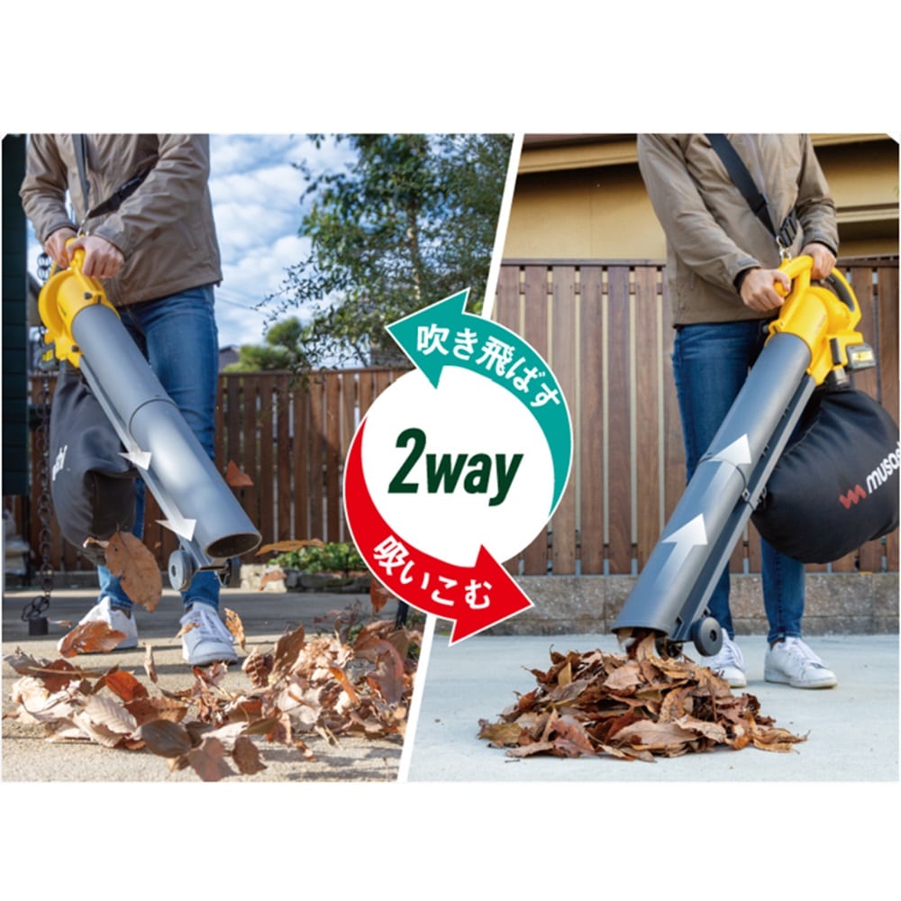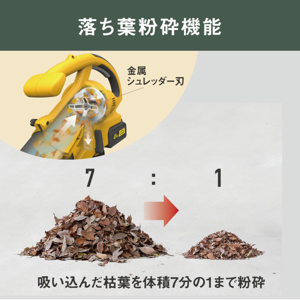●吹き飛ばし、吸込みの2wayで切替も手元で簡単 ●吸込んだ落ち葉、枝等は7分の1に粉砕 ●ブロアで吹き飛ばして集め、バキュームで吸い込む。作業効率的が高くお庭の掃除に革命を起こします。 ●充電式だからコードレスでどこでも使えて取り回し抜群、パワフルな40Vリチウムイオンバッテリー搭載 ●家と庭の掃除革命 玄関回り、通路、駐車場、芝生、砂利、荷台の掃除に