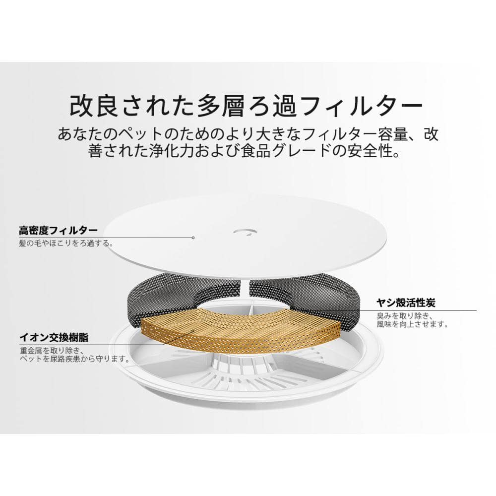 不純物フィルター、活性炭フィルター、軟水化フィルター(イオン交換樹脂)という三重濾過システムにより、埃、髪の毛、匂い、カルシウムなどを有効的に防ぎ、安心して綺麗な水を大切なペットにご提供いただけます。