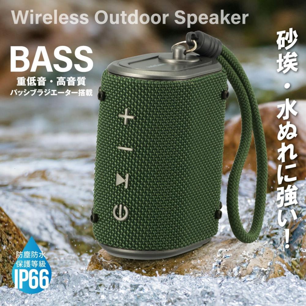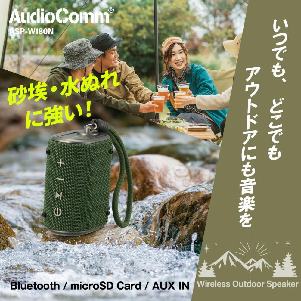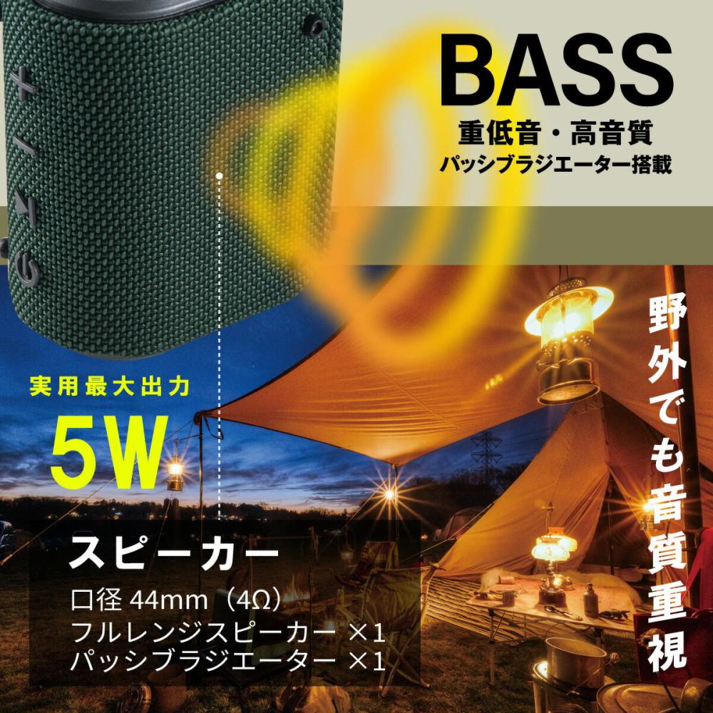 ・Bluetooth5.3でワイヤレス再生 ・microSD Card再生 ・着信・通話対応 ・AUX 外部音声入力 ・USB-C充電式 ・5時間連続再生 ・電源:DC5V (USB-C給電) ・内蔵バッテリー:リチウムイオン充電池(3.7V 1200mAh) ・実用最大出力:5W ・スピーカー:口径44mm、 フルレンジスピーカー×1、パッシブラジエーター×1 ・SN比:≧70dB ・再生周波数帯域:60Hz~18kHz ・接続端子:USB-Cポート(給電)、microSDカードスロット、 AUX IN端子(3.5mmステレオミニジャック) ・Bluetooth: 通信方式…Bluetooth標準規格 Ver.5.3 プロファイル…HFP、A2DP、AVRCP コーデック…SBC 変調方式/周波数帯域…GFSK/2.402~2.480GHz 最大通信距離…見通し 約10m(Class2) ・microSDカード:FAT・FAT32・exFAT 最大32GB、ファイル形式…MP3、WAV、FLAC ・内蔵マイク:全指向性 感度…-42dB ・充電時間:約2時間 (残量ゼロからフル充電まで) ・連続使用可能時間:約5時間(50%音量) ・許容動作温度/湿度:温度…5~35℃、湿度…35~80%(結露なしにて) ・防塵防水保護等級:防塵6級(耐塵形)…粉塵が中に入らない、防水6級(耐水形)…いかなる方向からの水の強い直接噴流によっても有害な影響を受けない ・付属品:専用充電コード、3.5mmステレオミニプラグコード、保証書、取扱説明書