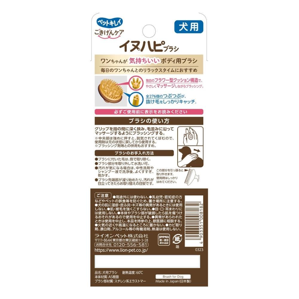 お取り扱い上の注意:●用途外には使わない。●乳幼児・認知症の方などやペットの誤食等を防ぐため、置き場所に注意する。●犬の肌に湿疹・皮ふ炎・キズ等の異常があるときには使用しない。●肌・被毛を強くこすらない。●目・口・耳まわりには使用しない。●本体やブラシ部が破損したら肌を傷つけるおそれがあるので使用を中止する。 ●異常があらわれたときは使用を中止し、本品を持参の上、獣医師に相談する。●火気の近くや高温になるところに置かない。●カビ取り剤、漂白剤、アルコール等の有機溶剤、熱湯は使用しない。