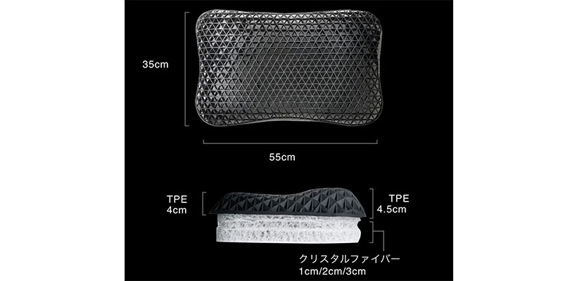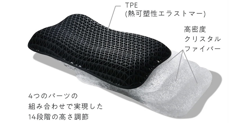 柔らかな素材TPEと心地良い弾力を生み出すクリスタルファイバー3層の組み合わせ。ファイバー特有の反発力がありながら、ふんわり立体的に頭から首まで優しく包み込むので、負担がかかりにくいのが特徴です。