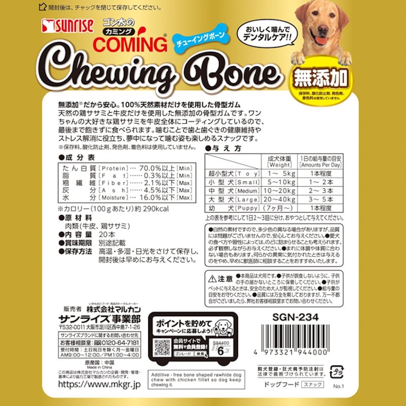 お取り扱い上の注意:●本商品は犬用です。●子供が誤食しないように、子供の手の届かないところに保管してください。●子供がペットに与えているときは、安全のため大人が監視してください。●給与量の目安をお守りください。●品質には万全を期しておりますが、万一不都合がございましたら、弊社お客様相談室までお問い合わせください。●愛犬の食べ方や習性によっては、のどに詰まらせることも考えられます。必ず観察しながらお与えください。