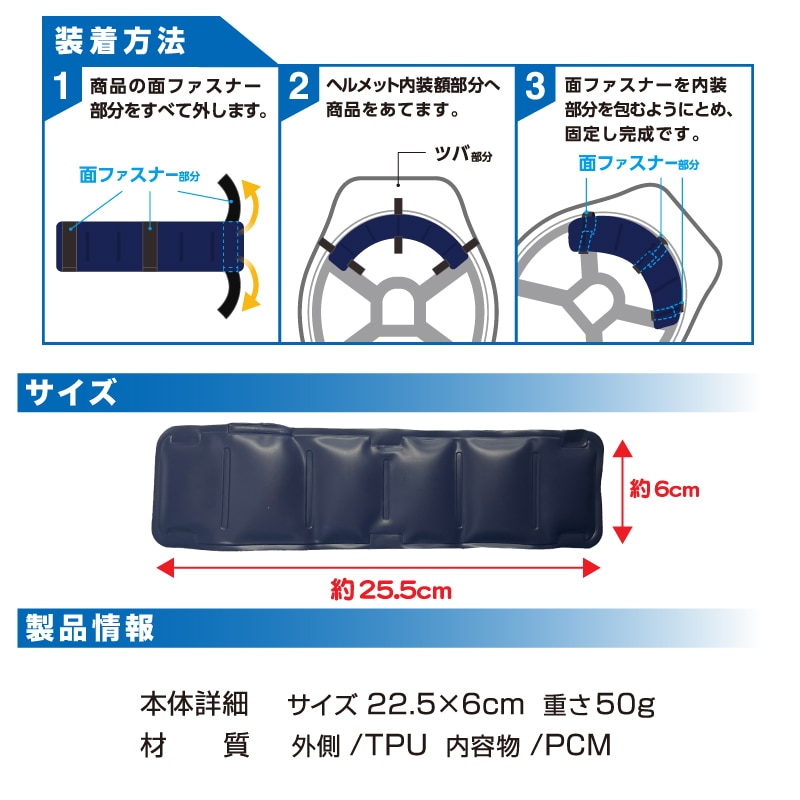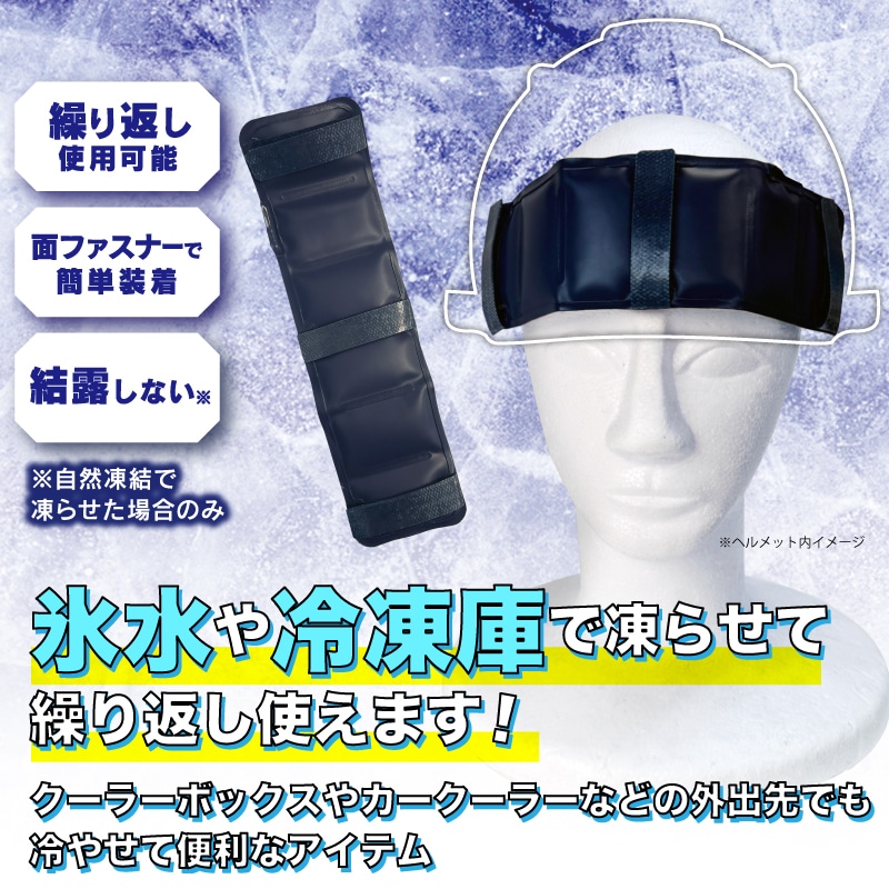 ●ヘルメットに装着して使用してください。 ●22℃以下で自然凍結します。 ●繰り返し使用可能です。 ●酷暑の環境でも快適な冷感素材です。 ●簡単装着が可能です。