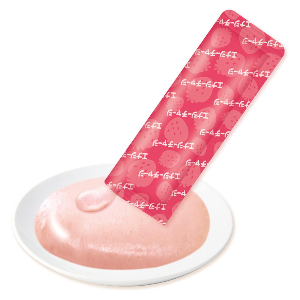 原材料・成分:鶏ささみ、植物性油脂、タピオカ澱粉、イチゴ果汁、大豆たん白、食物繊維、オリゴ糖、ブドウ糖、乳化剤、増粘安定剤(グアーガム)、ビタミン類(C、A、D3、E、K3、B1、B2、パントテン酸、ナイアシン、B6、葉酸、B12)、ミネラル類(鉄、亜鉛、銅、マンガン、ヨウ素、セレン、塩化ナトリウム)、アミノ酸類(タウリン)、酸化防止剤(ビタミンE)、香料