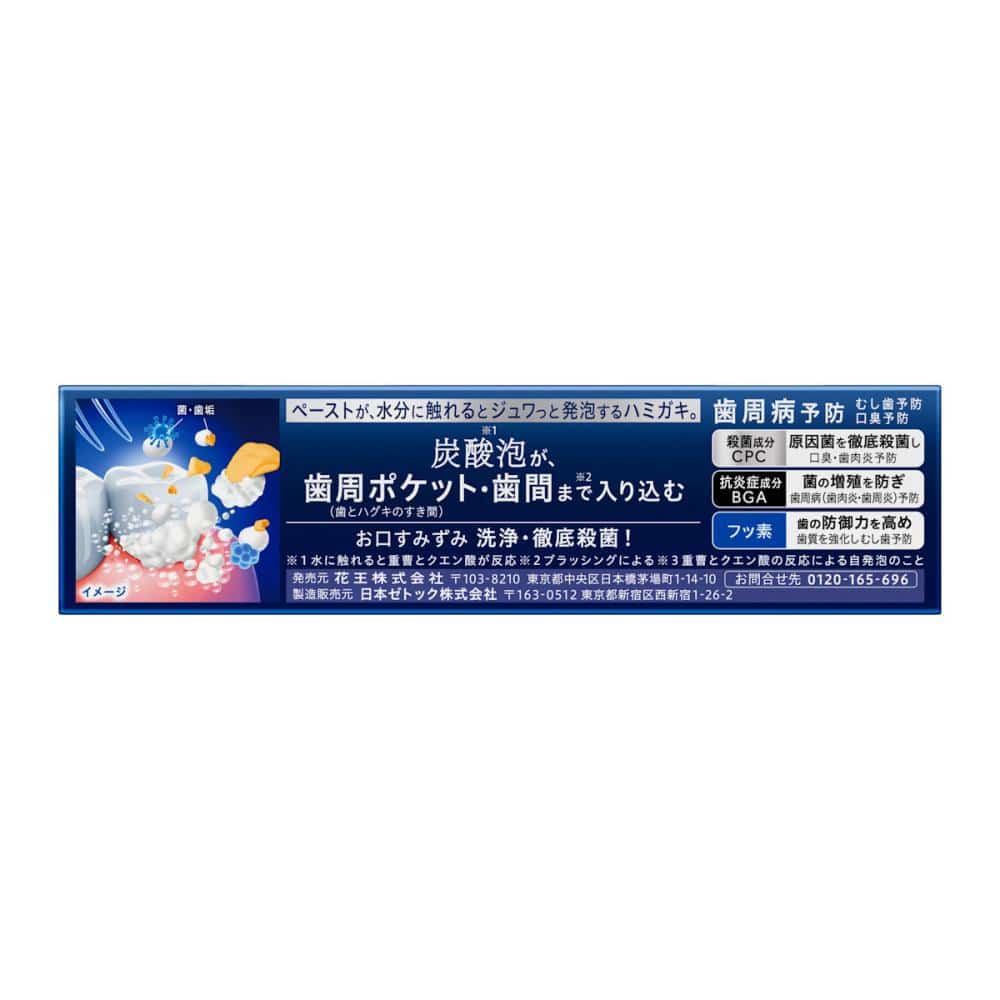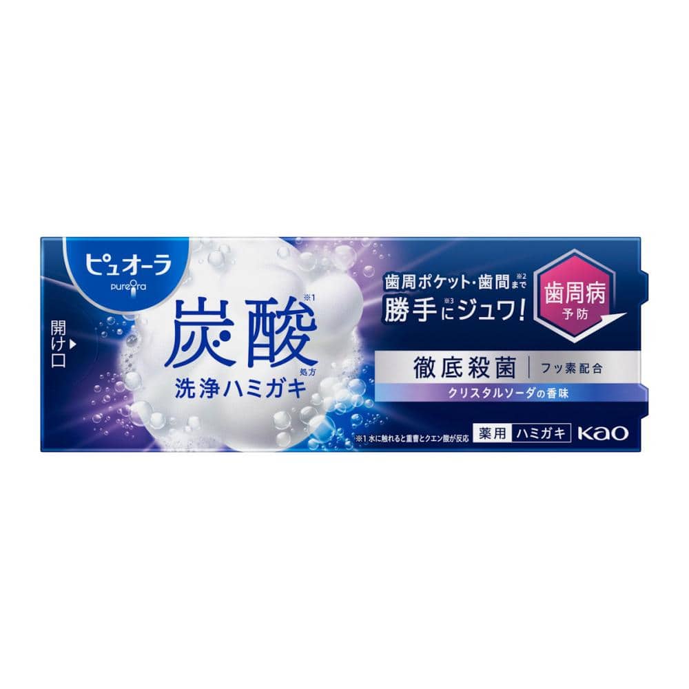 ペースト状から水と触れて炭酸(※1)が発生するハミガキ。 勝手に(※2)ジュワ!炭酸泡が歯周ポケットや歯間まで(※3)入り込む。 洗浄・徹底殺菌!殺菌成分塩化セチルピリジニウム・抗炎症成分 Bーグリチルレチン酸・フッ素配合。 歯周病・むし歯・口臭予防。 クリスタルソーダの香味(医薬部外品) ※1:水に触れると重曹とクエン酸が反応 ※2:重曹とクエン酸の反応による自発泡のこと ※3:ブラッシングによる