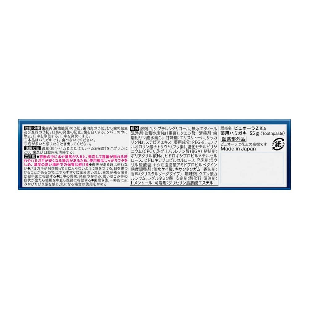 原材料・成分:溶剤:1,3-ブチレングリコール、無水エタノール 洗浄剤:炭酸水素Na(重曹)、クエン酸 清掃剤:歯磨用リン酸水素Ca 甘味剤:エリスリトール、サッカリンNa、ステビアエキス 薬用成分:PEG-8、モノフルオロリン酸ナトリウム(フッ素)、塩化セチルピリジニウム(CPC)、B-グリチルレチン酸(BGA) 粘結剤:ポリアクリル酸Na、ヒドロキシプロピルメチルセルロース、ヒドロキシプロピルセルロース 発泡剤:ラウリル硫酸塩、ヤシ油脂肪酸アミドプロピルベタイン 粘度調整剤:無水ケイ酸、キサンタンガム 香味剤:香料(クリスタルソーダタイプ) 矯味剤:クエン酸カルシウム、L-グルタミン酸 安定剤:酸化Ti 清涼剤:l-メントール 可溶剤:グリセリン脂肪酸エステル