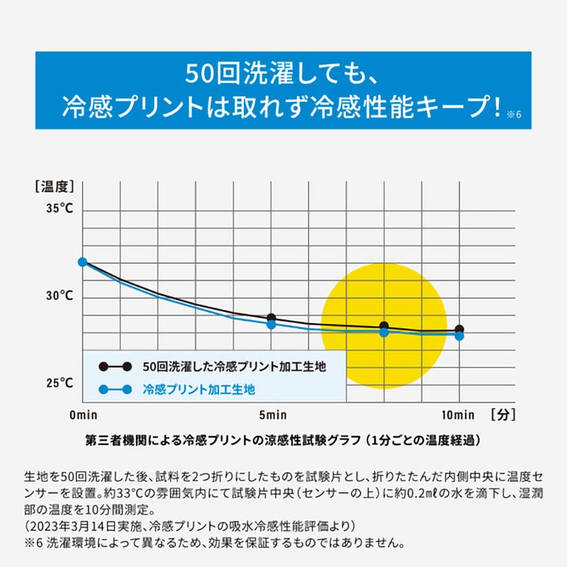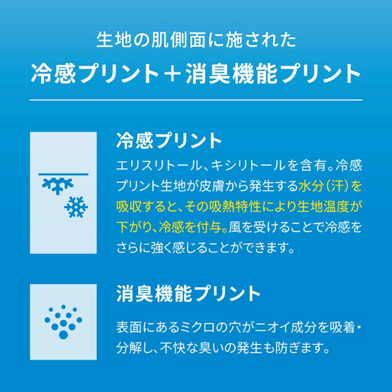 ●水分(汗)でウェア自体を瞬間冷却する最先端テクノロジーの暑さ対策インナーです。●着用し約10秒後には生地温度が下がり、持続的に「冷感」を感じられます。●特殊プリントで処理した繊維が人の皮膚から発生する水分(汗)を吸収する吸熱特性により繊維自体の温度を下げ冷感を付与する構造です。●風を受けることで冷感をより強く感じることができます。●吸水速乾性があるので汗をかいても着用時の快適性に繋がります。