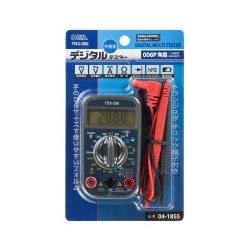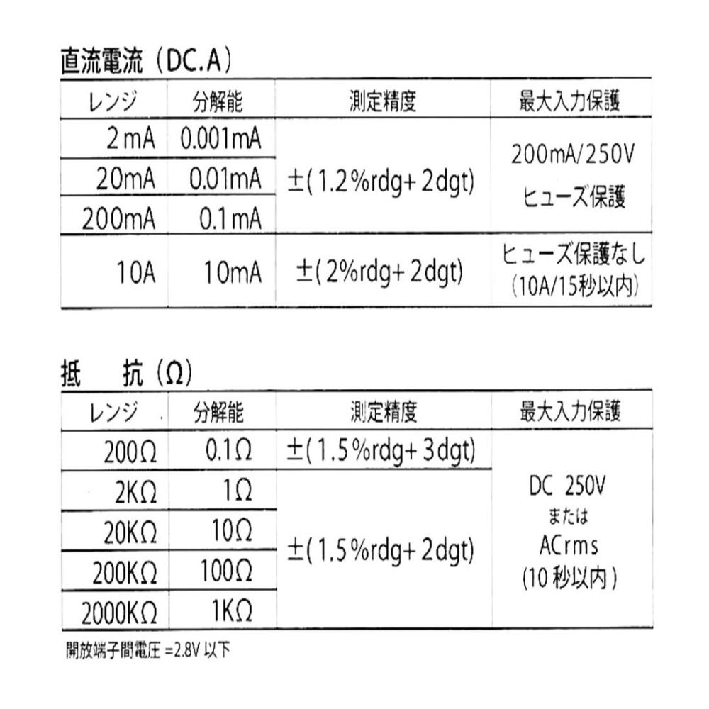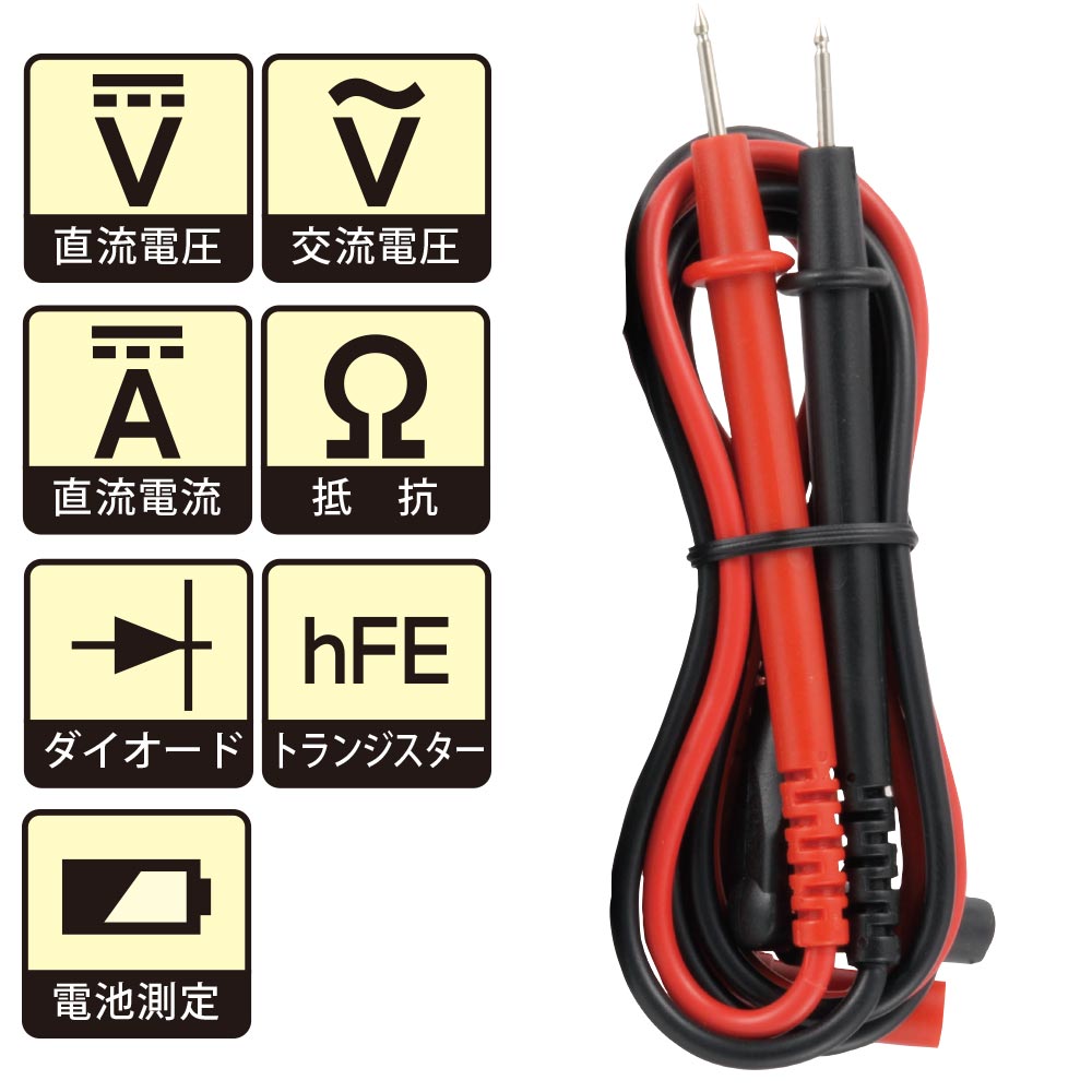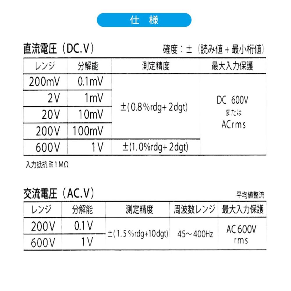●電池の寿命チェックに! ●電気製品の故障チェックに! ●軽量で使いやすく機能的なデザイン。 ●トランジスタチェック端子付き。 ●日本語表示板仕様でわかりやすい。 ●測定機能 直流電圧、交流電圧 、直流電流、抵抗、電池測定、ダイオード、トランジスタチェック 電池チェック ●作動方法:2重積分方式 ●表示:31/2桁デジタル表示、最大表示 1999 ●極性表示:自動(-符号のみ点灯) ●オーバーレンジ:1または-1マークが点灯 ●作動温度・湿度:0~50℃、80%RH以下(結露のないこと) ●保存温度・湿度:-15~50℃、70%RH以下(結露のないこと) ●電源:アルカリ乾電池(006P 9V)使用時、約200時間 ●消費電力:5mW(TYP) ●寸法・質量:約幅59×高さ105×奥行き27mm、約100g ●付属品:006P 9V乾電池1個(動作確認用:内蔵)、ミニカンヒューズ1個(200mA/250V:内蔵)、テスト棒(赤/黒)1組、保証書付き取扱説明書
