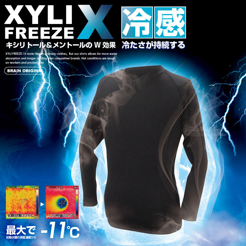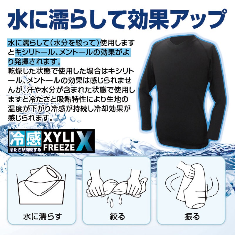 【商品説明】 ● キシリトール+メントールのひんやりW効果! ● 生地のキシリトールに汗が反応し涼感ゲット!人の皮膚から発生する水分(汗)を吸収するとその吸熱特性により繊維の温度が下がり、優れた冷感効果を実感できます。 ● メントールが、神経を刺激して冷感が持続します。接触冷感とはちがった持続する冷感。冷たさの持続性が違います。 ● 水に濡らして(水分を絞って)使用しますとキシリトール、メントールの効果がより発揮されます。 ● 乾燥した状態で使用した場合はキシリトール、メントールの効果は感じられませんが、汗や水分が含まれた状態で使用しますと冷たさと吸熱特性により生地の温度が下がり冷感が持続し冷却効果が感じられます。 ● 高いUVカット率、ストレッチ伸縮 ● (財) 日本文化用品安全試験所にて実施