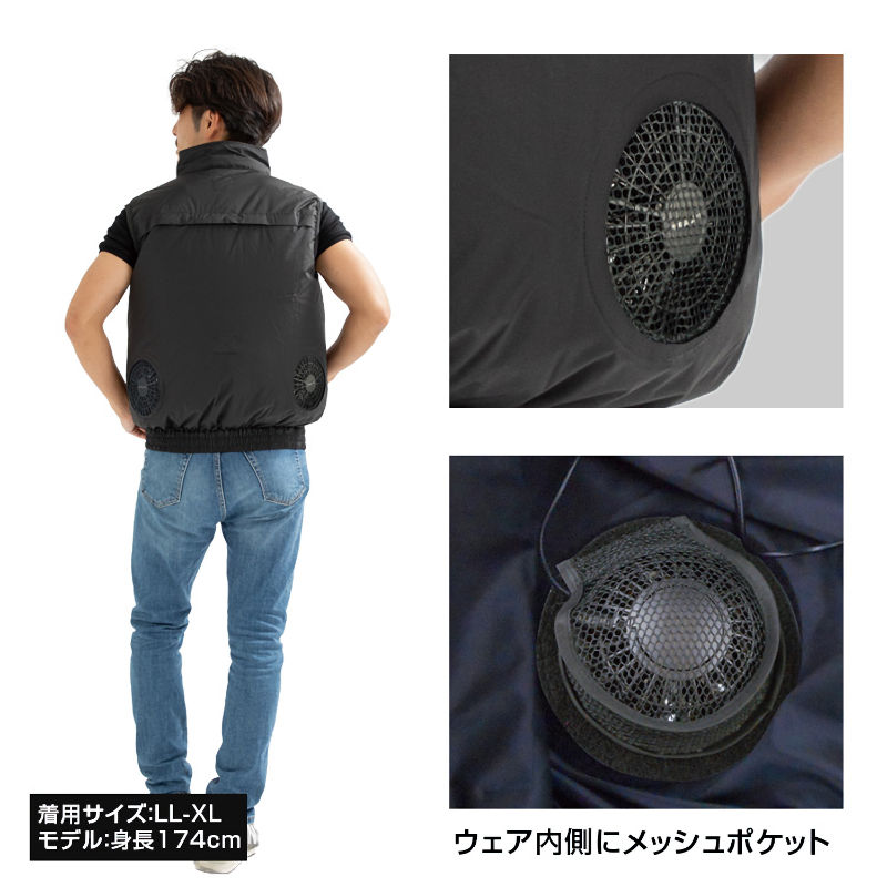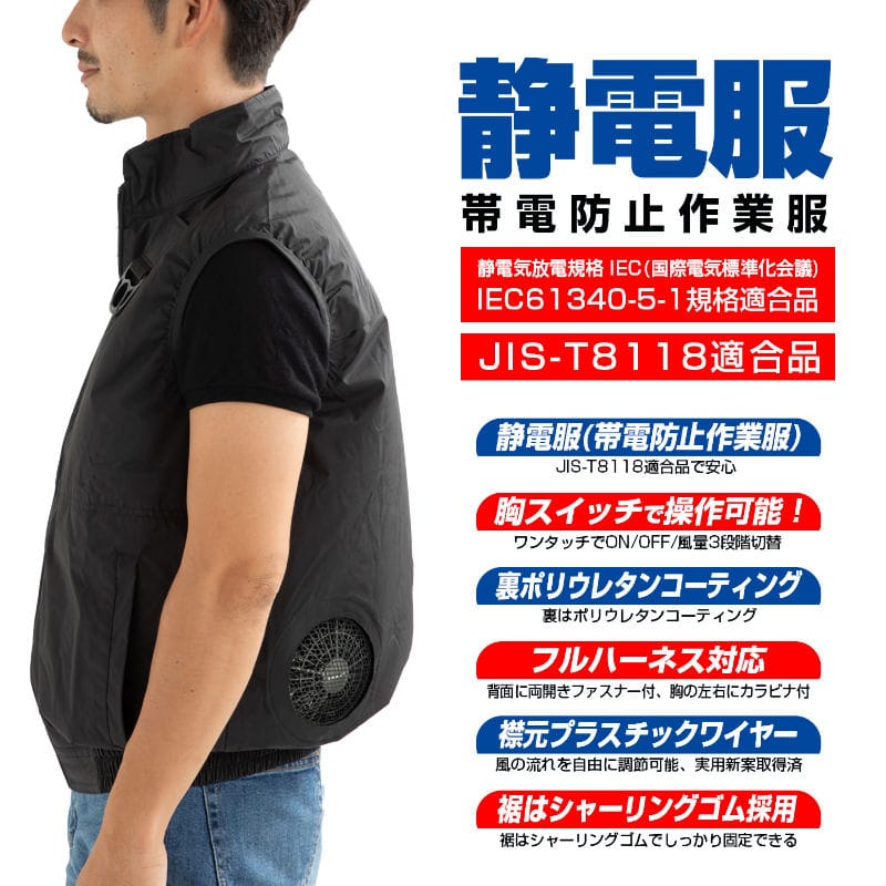 "【商品説明】 ● 静電服(帯電防止作業服)JIS-T8118適合品。作業中の静電気帯電による爆発・火災等の事故などを防止するための作業服です。 ● 生地裏ポリウレタンコーティング。 ● フルハーネス着用にも対応。フルハーネスを着用した上から着られます。背中部分はチャック式になっており、安全帯ランヤードを通せるようになっています。使用しない時は、チャックが隠れる仕様。長袖を着用しない現場におすすめです。 ● 両胸にカラナビ付き。取り外し可能なカラナビ付きで、フックをかけることが可能です。 ● ウェアに取付けたファンがウェア内へ送風。腕部分や裾は、ゴムで風を逃がさず、ウエア内の体感温度を下げます。 ● スタンドカラーで後頭部へ風が抜けるように工夫されています。 ● 襟元プラスチックワイヤーで風の流れを自由自在に調整可能、実用新案取得済み。 ● ファンの取り付けが簡単になりました。メッシュポケットにファンを入れるだけ。 【セット内容】 服(7.4V胸スイッチ付ケーブル付属)+BR-283(7.4Vファン×2個、7.4Vバッテリー、7.4V充電器) 【7.4Vバッテリー/7.4V用ファン】 バッテリー容量:5200mAh 出力:【強】7V 【中】6V 【弱】5V 使用時間目安:【強】(約)8時間 【中】(約)12時間 【弱】(約)15時間 電池寿命:充放電回数約500回 ※500回を保証するものではありません 消費電力:38.48Wh サイズ/重さ:(約)72×92×22mm (約)220g 充電時間:(約)3~6時間 ■バッテリーの注意事項 リチウムイオンバッテリーは、電池残量がゼロになった場合は、3日以内に充電してください。また、長期間使用しない場合も3か月に一回程度、定期的に充電してください。※※電池残量ゼロのまま放置すると、完全放電し再使用できなくなりますので、十分ご注意ください※※ 胸スイッチ付きケーブルは服に装着されておりますので、別売りはしておりません。"