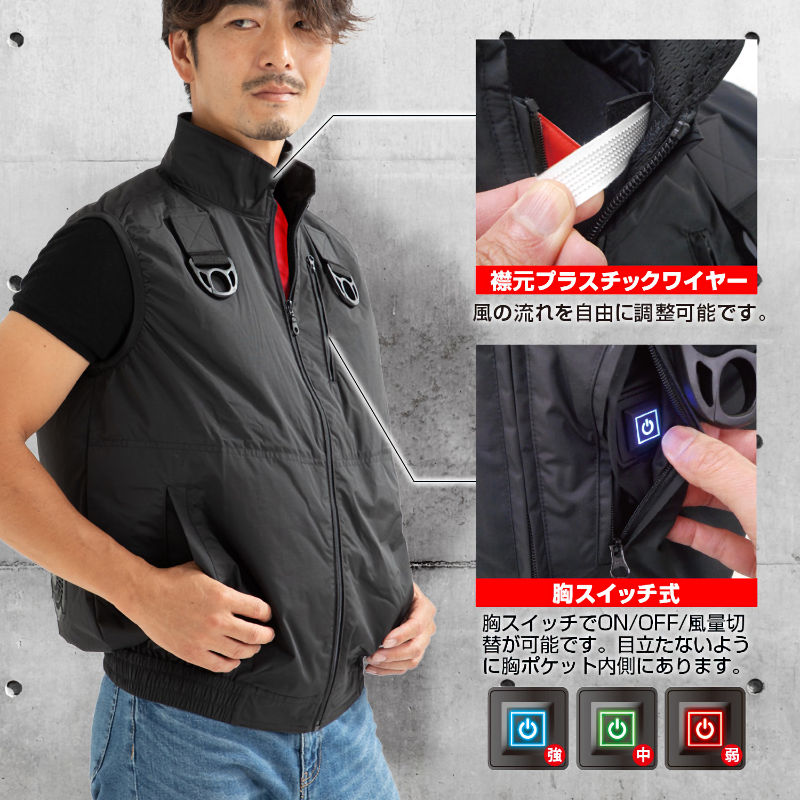 【商品説明】 ● 静電服(帯電防止作業服)JIS-T8118適合品。作業中の静電気帯電による爆発・火災等の事故などを防止するための作業服です。 ● 生地裏ポリウレタンコーティング。 ● 空調ベストの胸スイッチタイプ!従来はわざわざバッテリーを出してON/OFF/風量調整を行っていましたが、それらの操作がすべて胸のスイッチだけで行えます。バッテリーを取り出して操作する必要がありません。胸スイッチで強・中・弱、電源ON/OFFが可能です。スイッチが光るので風量もすぐにわかります。 ● フルハーネス着用にも対応。フルハーネスを着用した上から着られます。背中部分はチャック式になっており、安全帯ランヤードを通せるようになっています。使用しない時は、チャックが隠れる仕様。長袖を着用しない現場におすすめです。 ● 両胸にカラナビ付き。取り外し可能なカラナビ付きで、フックをかけることが可能です。 ● ウェアに取付けたファンがウェア内へ送風。腕部分や裾は、ゴムで風を逃がさず、ウエア内の体感温度を下げます。 ● スタンドカラーで後頭部へ風が抜けるように工夫されています。 ● 襟元プラスチックワイヤーで風の流れを自由自在に調整可能、実用新案取得済み。 ● ファンの取り付けが簡単になりました。メッシュポケットにファンを入れるだけ。 【セット内容】 服のみ(7.4V胸スイッチ付ケーブル付属) ※ファン、バッテリー、充電器は別売り。 対応ファンユニットは「BR-283」 (ウェア洗濯表示) 液温は40 ℃を限度とし、洗濯機で弱い処理が出来る 塩素系及び酸素系漂白剤の使用禁止 タンブル乾燥禁止 日陰のつり干しがよい 底面温度150℃を限度としてアイロン仕上げができる 石油系溶剤による弱いドライクリーニングができる 弱い操作によるウエットクリーニングができる