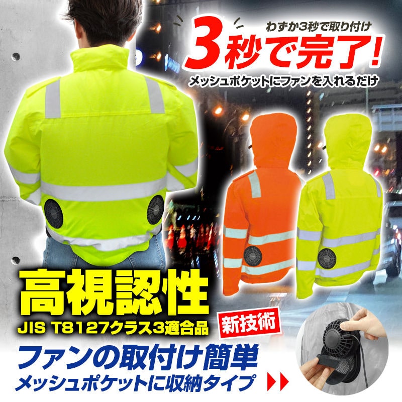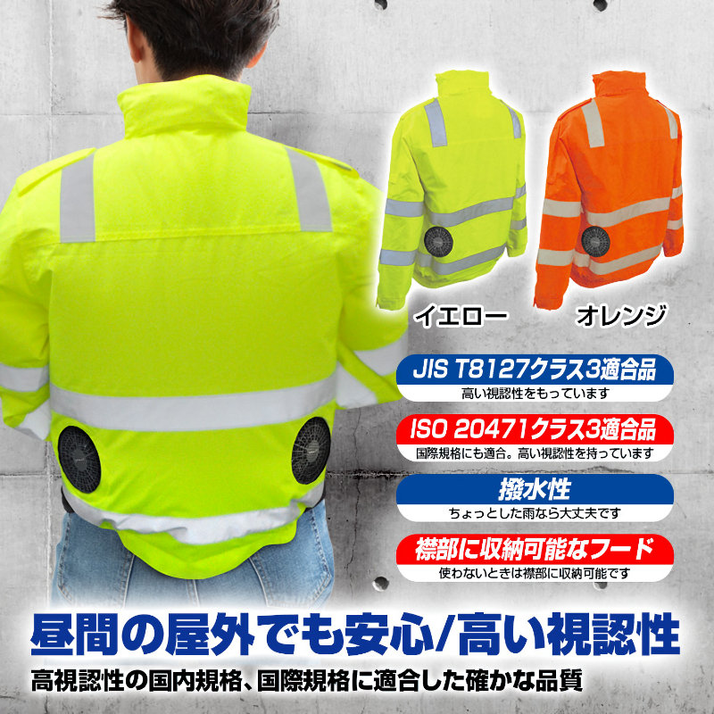 【商品説明】 ●空調エアコンジャケット(ISO20471CLASS3/JIST8127CLASS3)規格に適合した、高視認性安全空調エアコンジャケットです。 ●高い高視認性に加え、撥水性も備えています。 ●フードは収納が可能。高輝度の蛍光生地、反射材、デザインのジャケット。 ●夜間の作業はもちろん明るい場所(昼間の屋外作業)においても、その高い視認性を発揮。 ●高視認性安全服(高視認作業服) 国際規格ISO20471クラス3(JIST8127相当)に適合。高輝度の蛍光生地、反射材、デザインとなっています。 ●撥水性もあるので多少の水滴なら大丈夫です。 ●フードは襟部に収納が可能です。 【セット内容】 ジャケットのみ(胸スイッチ無し) ※ファン、バッテリー、充電器は別売り。 対応ファンユニット(※胸スイッチ無しタイプ)は「BR-283S」
