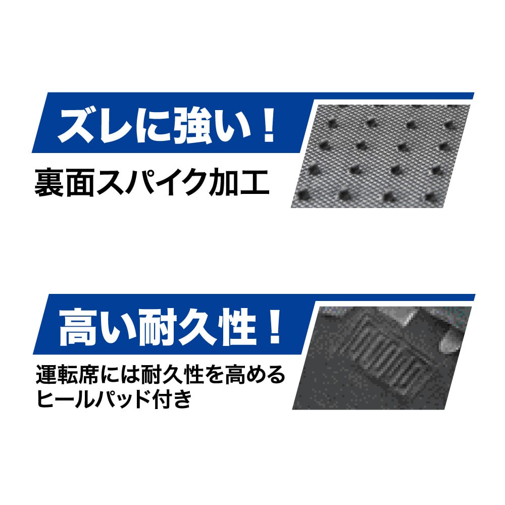 運転席には耐久性を高める為にヒールパッドを装着。裏面はスパイク加工を施してズレにくい設計に。別売りのマットフックにも対応しているので、併せて使えば更にズレにくくなります。