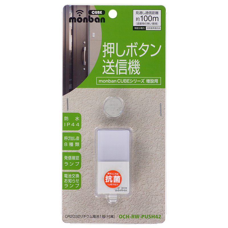 ●呼び出し音8種類 ●防水IP44(防まつ形、JIS C 0920:2003による) ●発信確認ランプ ●電池交換お知らせランプ ●送信機は指で押す際に触れるところが抗菌仕様(Ag成分配合) ■外形寸法:幅33×高さ74.5×奥行き19.5mm(取り付けホルダーを含む) ■本体質量:約26g(取り付けホルダーを含む) ■送受信周波数:314.8MHz(FM方式) ■動作距離:約100m(直線見通し・遮蔽物の無い環境) ■設置場所:室内、室外(IP44防まつ形、JIS C 0920:2003による) ■呼び出し音:8種類(送信機毎に設定可) ■電源:CR2032リチウム電池×1個 ※ブルーのランプが点滅する場合は電池を交換してください。 ■電池寿命:1日5回使用で約1年間 ■使用環境温度:-20℃~50℃ ■付属品:取り付けネジ×2本、両面テープ×1個、CR2032リチウム電池×1個(動作確認用) ※適合受信機:光フラッシュ電池式受信機(OCH-DC47-BLUE)、光フラッシュAC電源式受信機(OCH-AC48-BLUE)