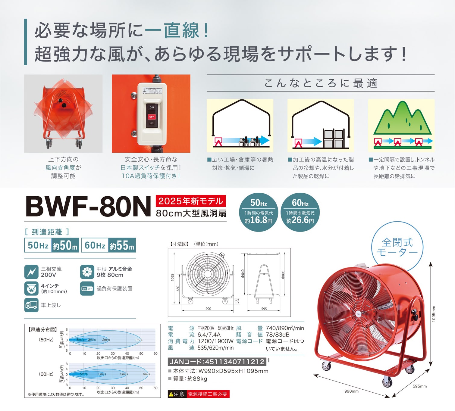 ●電源:三相200V 50/60Hz ●電流:6.4A/7.4A ●消費電力:1200/1900W ●風速:535/620m/min ●風量:740/890m3/min ●騒音値:78/83dB