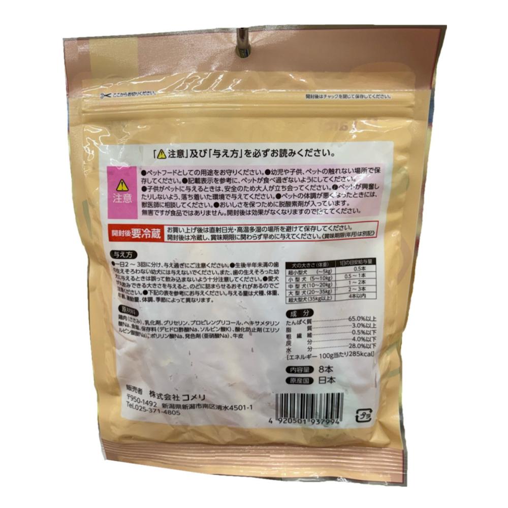 原材料:鶏肉(ささみ)、乳化剤、グリセリン、プロピレングリコール、ヘキサメタリン酸Na、食塩、保存料(デヒドロ酢酸Na、ソルビン酸K)、酸化防止剤(エリソルビン酸Na)、ポリリン酸Na、発色剤(亜硝酸Na)、牛皮