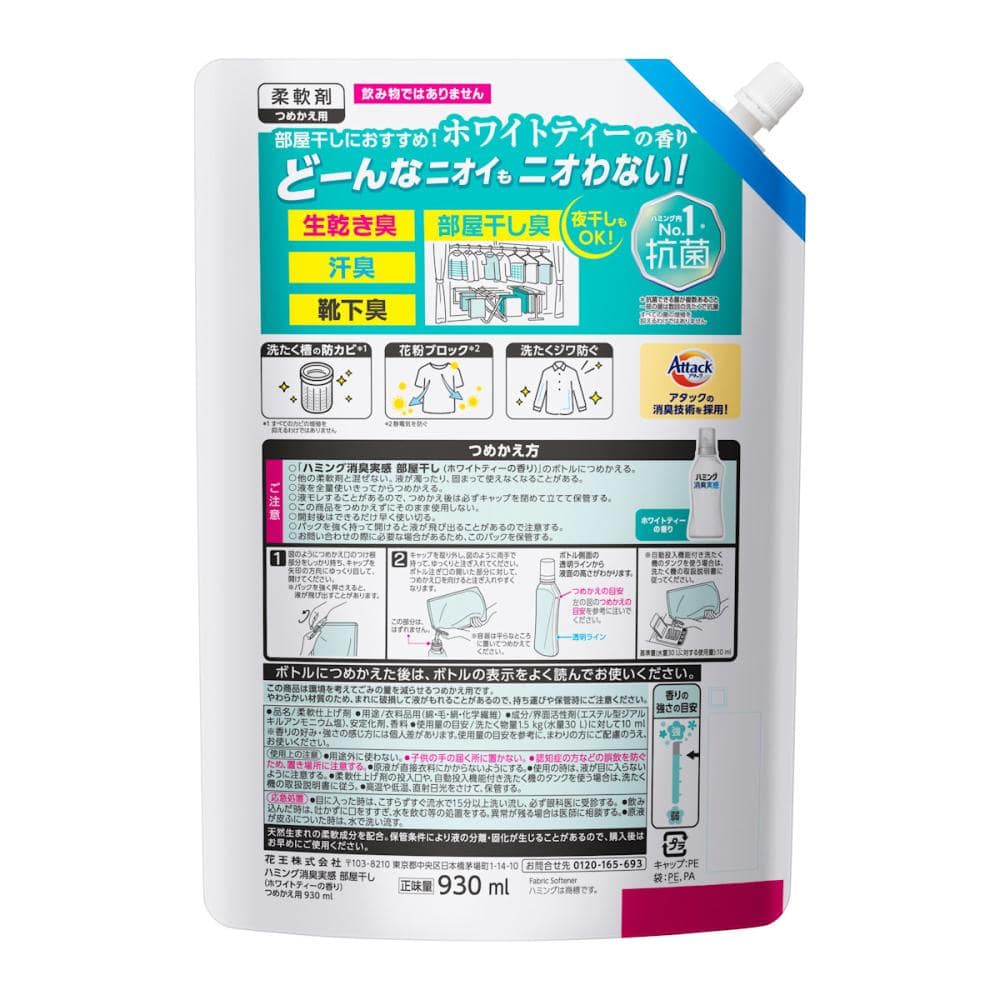 使用上の注意:つめかえ方 ご注意 ○「ハミング消臭実感 部屋干し (ホワイトティーの香り)」のボトルにつめかえる。 ○他の柔軟剤と混ぜない。液が濁ったり、固まって使えなくなることがある。 ○液を全量使いきってからつめかえる。 ○液モレすることがあるので、つめかえ後は必ずキャップを閉めて立てて保管する。 ○この商品をつめかえずにそのまま使用しない。 ○開封後はできるだけ早く使い切る。 ○パックを強く持って開けると液が飛び出ることがあるので注意する。 ○お問い合わせの際に必要な場合があるため、このパックを保管する。 使用上の注意 ●用途外に使わない。 ●子供の手の届く所に置かない。 ●認知症の方などの誤飲を防ぐため、置き場所に注意する。 ●原液が直接衣料にかからないようにする。 ●使用の時は、液が目に入らないように注意する。 ●柔軟仕上げ剤の投入口や、自動投入機能付き洗たく機のタンクを使う場合は、洗たく機の取扱説明書に従う。 ●高温や低温、直射日光をさけて、保管する。