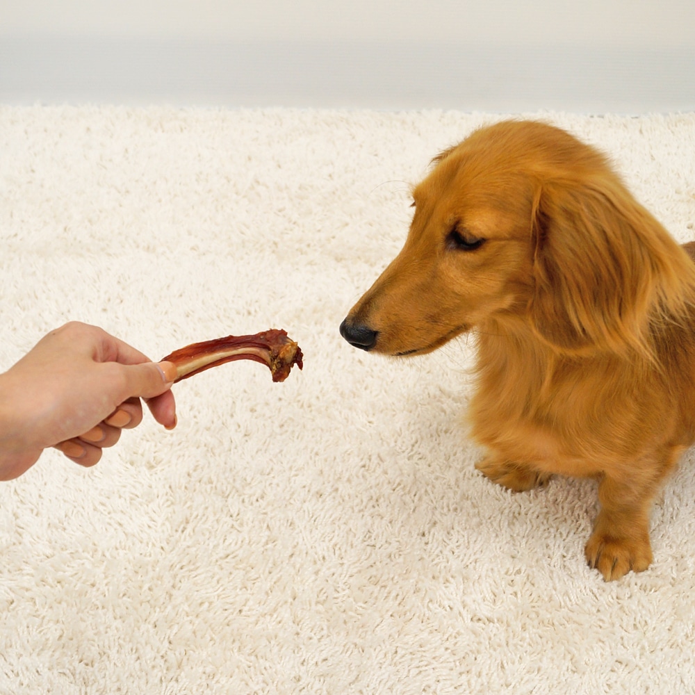 細くしなやかで、食べやすい若い牛の骨を使用していますので、やわらかいフードが続いた時や、かたいものを食べなれていない愛犬にもおすすめです。