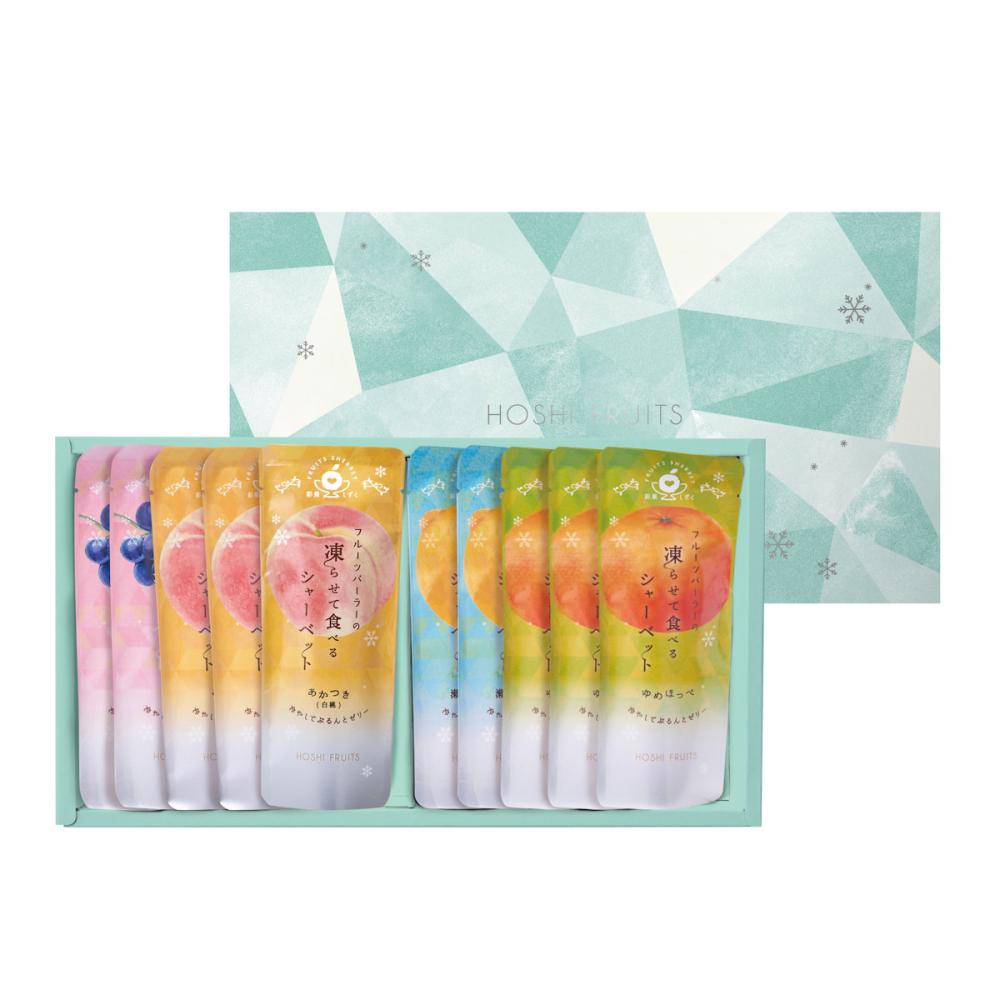 ゆめほっぺ・瀬戸内レモン・福島のあかつき(白桃)・ピオーネと、日本の豊かな気候で育った国産フルーツ果汁を使用した贅沢なジュレを凍らせて食べるシャーベット。まるでフルーツを食べているかのような濃厚な甘みや爽やかな酸味が口いっぱいに広がります。そのままゼリーとして味わえるのも魅力的です。