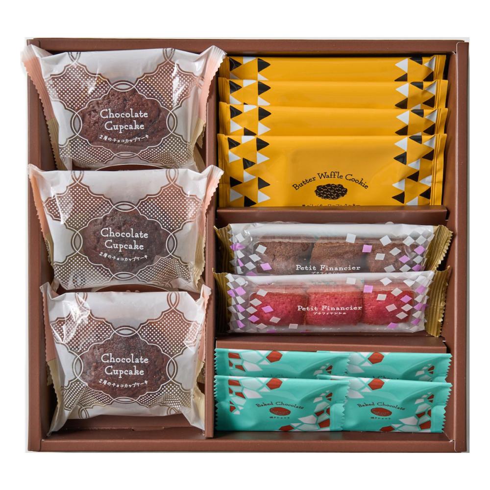 内容量:2層のチョコカップケーキ×3個、焼きショコラ×4個、焦がしバターワッフルクッキー×4枚、プチフィナンシェ(ショコラ・フランボワーズ)×各1袋(3個入り) 8大アレルゲン:卵,乳,小麦