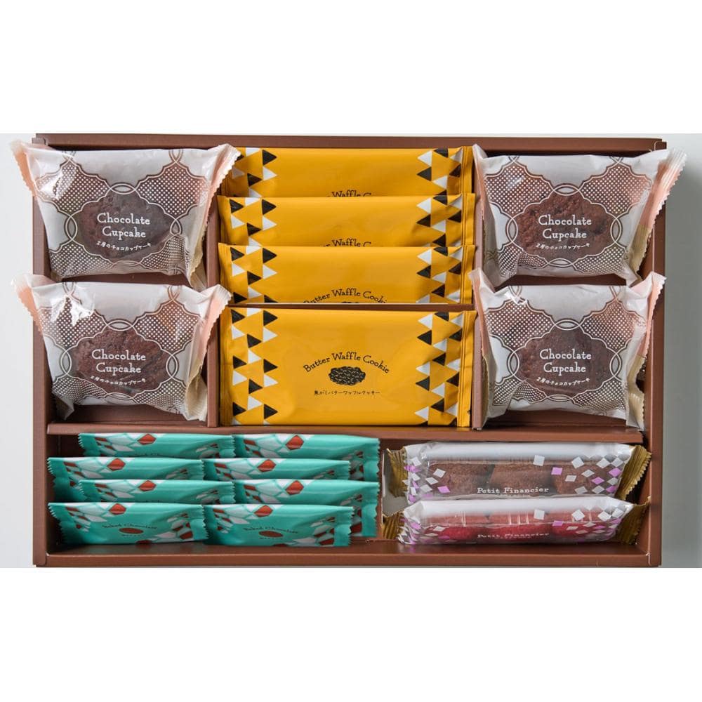 内容量:2層のチョコカップケーキ×4個、焼きショコラ×8個、焦がしバターワッフルクッキー×4枚、プチフィナンシェ(ショコラ・フランボワーズ)×各1袋(3個入り) 8大アレルゲン:卵,乳,小麦
