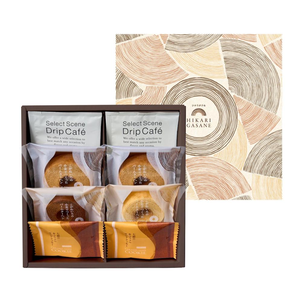 内容量:ふんわりバームクーヘン(ミルク・ココア×各1個、黒糖×2個)、七層のキャラメルサンドクッキー×2個、三喜屋珈琲のレギュラーコーヒー×2袋 8大アレルゲン:卵,乳,小麦