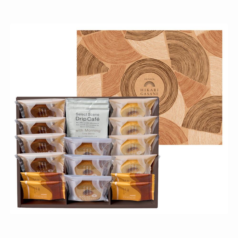 内容量:ふんわりバームクーヘン(ミルク・ココア×各4個、黒糖×3個)、七層のキャラメルサンドクッキー×4個、三喜屋珈琲のレギュラーコーヒー×3袋 8大アレルゲン:卵,乳,小麦