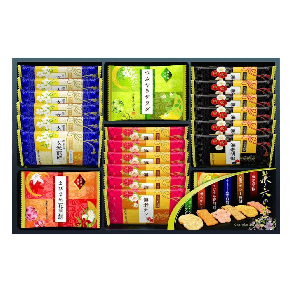 内容量:海老カレー煎餅×6枚、黒ごま入り玄米煎餅×6枚、海老胡椒煎餅×6枚、えびまめ花煎餅×3枚、つぶやきサラダ煎餅×3枚、金澤カレー煎餅×3枚 8大アレルゲン:乳,えび