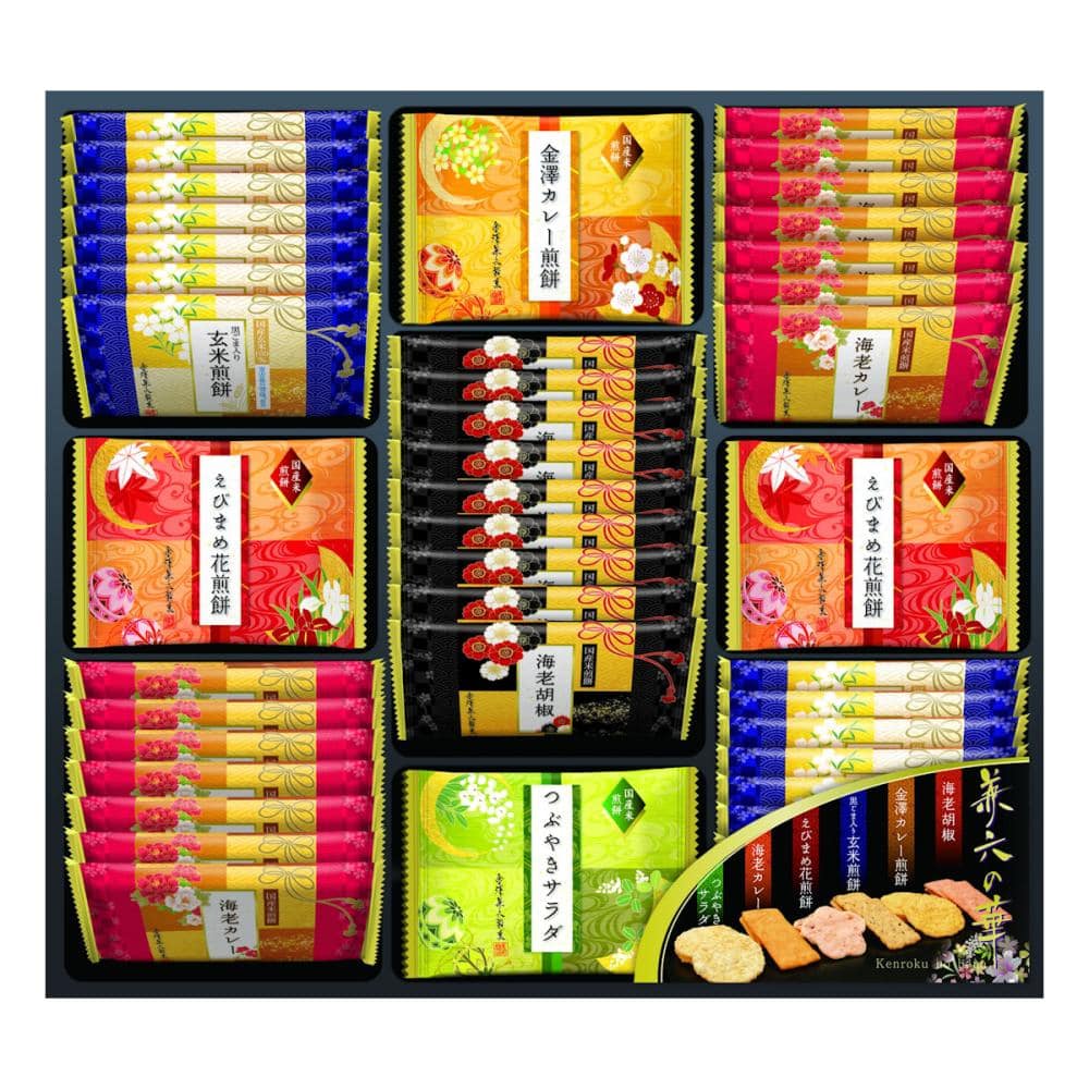 内容量:海老カレー煎餅×14枚、黒ごま入り玄米煎餅×14枚、えびまめ花煎餅×10枚、海老胡椒煎餅×9枚、つぶやきサラダ煎餅×5枚、金澤カレー煎餅×5枚 8大アレルゲン:乳,えび