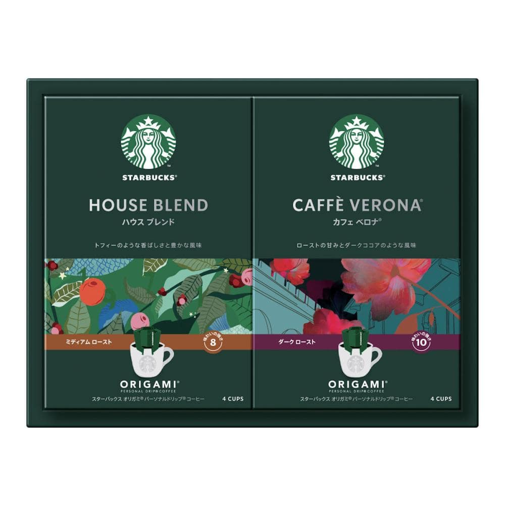 一杯分の美味しさを味わえるドリップタイプのスターバックスオリガミ。一滴一滴を丁寧に淹れる贅沢な時間を、定番から深煎りコーヒーまで豊富なフレーバーでお楽しみいただけます。 トフィーのような香ばしさと豊かな風味のハウス ブレンドと、ローストの甘みとダークココアのような風味のカフェ ベロナの詰合せ。ご挨拶やお祝い、返礼などにぴったりです。