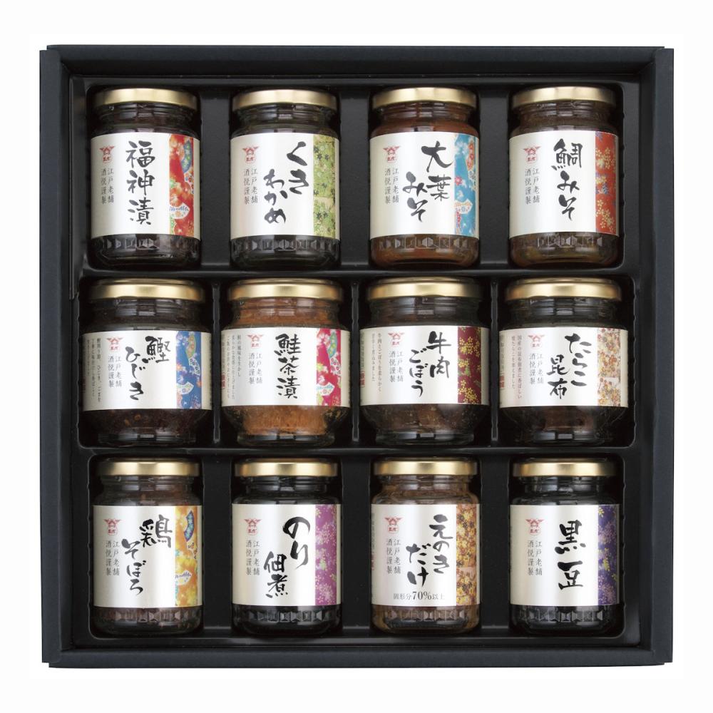 内容量:福神漬90g、くきわかめ75g、のり佃煮95g、鯛みそ100g、鶏そぼろ50g、えのきだけ90g、大葉みそ100g、黒豆100g、鰹ひじき40g、たらこ昆布50g、鮭茶漬60g、牛肉ごぼう55g×各1 8大アレルゲン:小麦