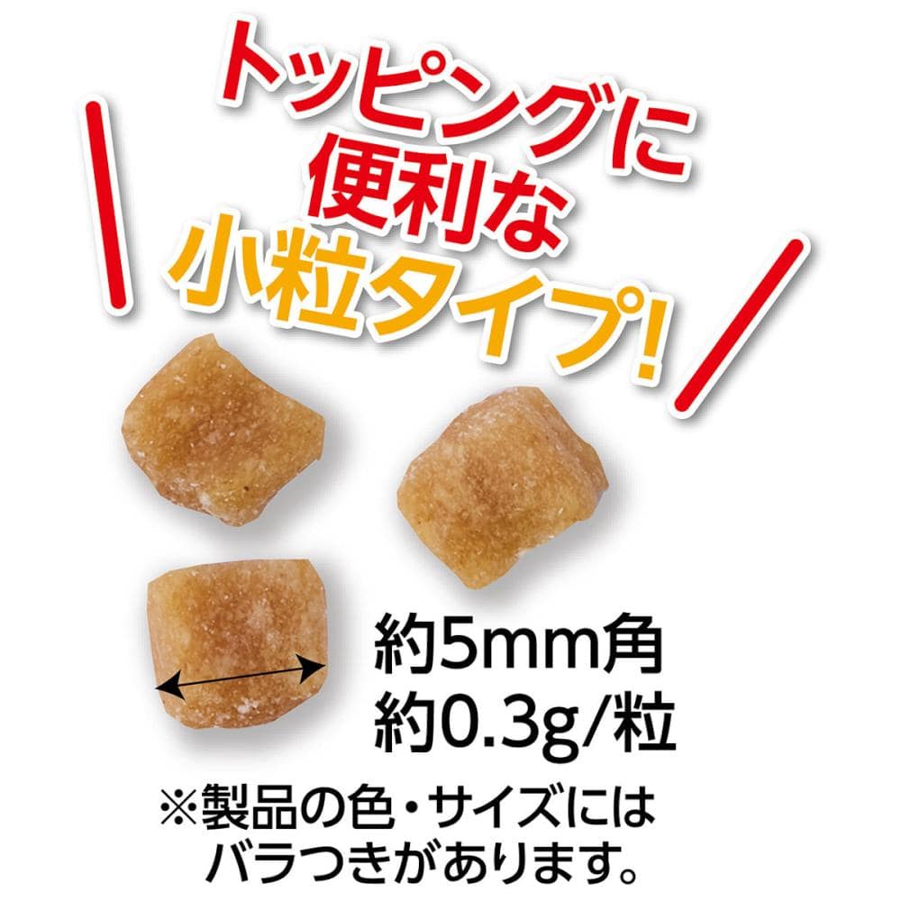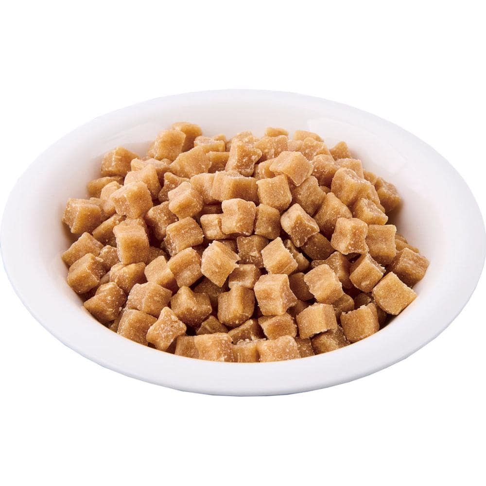原材料・成分:肉類(鶏・鶏レバー)、小麦粉、糖類、とうもろこし、大豆たん白、おから、小麦たん白、オリゴ糖、コラーゲン、地鶏エキス、酵母、乳酸菌(KH-2株(熱処理済み))、かぼちゃ、プロピレングリコール、ミネラル類(リン・カルシウム・ナトリウム・塩素・亜鉛・銅・ヨウ素・コバルト)、ソルビトール、メチオニン、保存料(ソルビン酸K、デヒドロ酢酸Na)、ポリリン酸Na、ビタミン類(A・B2・B12・D・E・コリン・パントテン酸)、リノレン酸